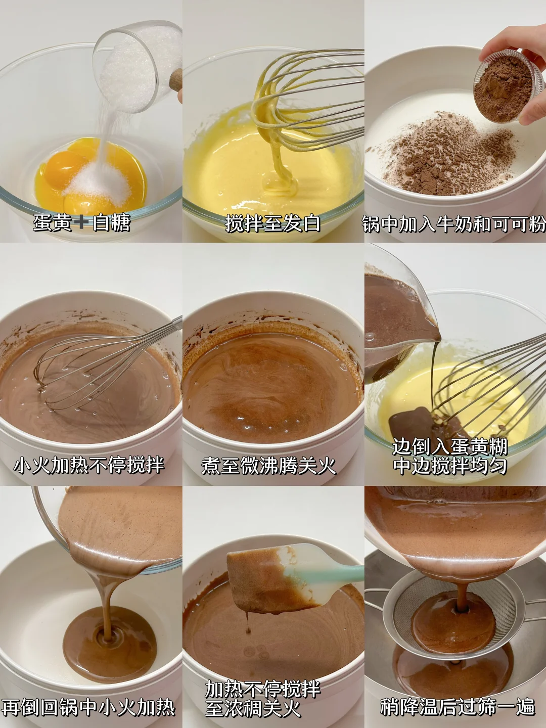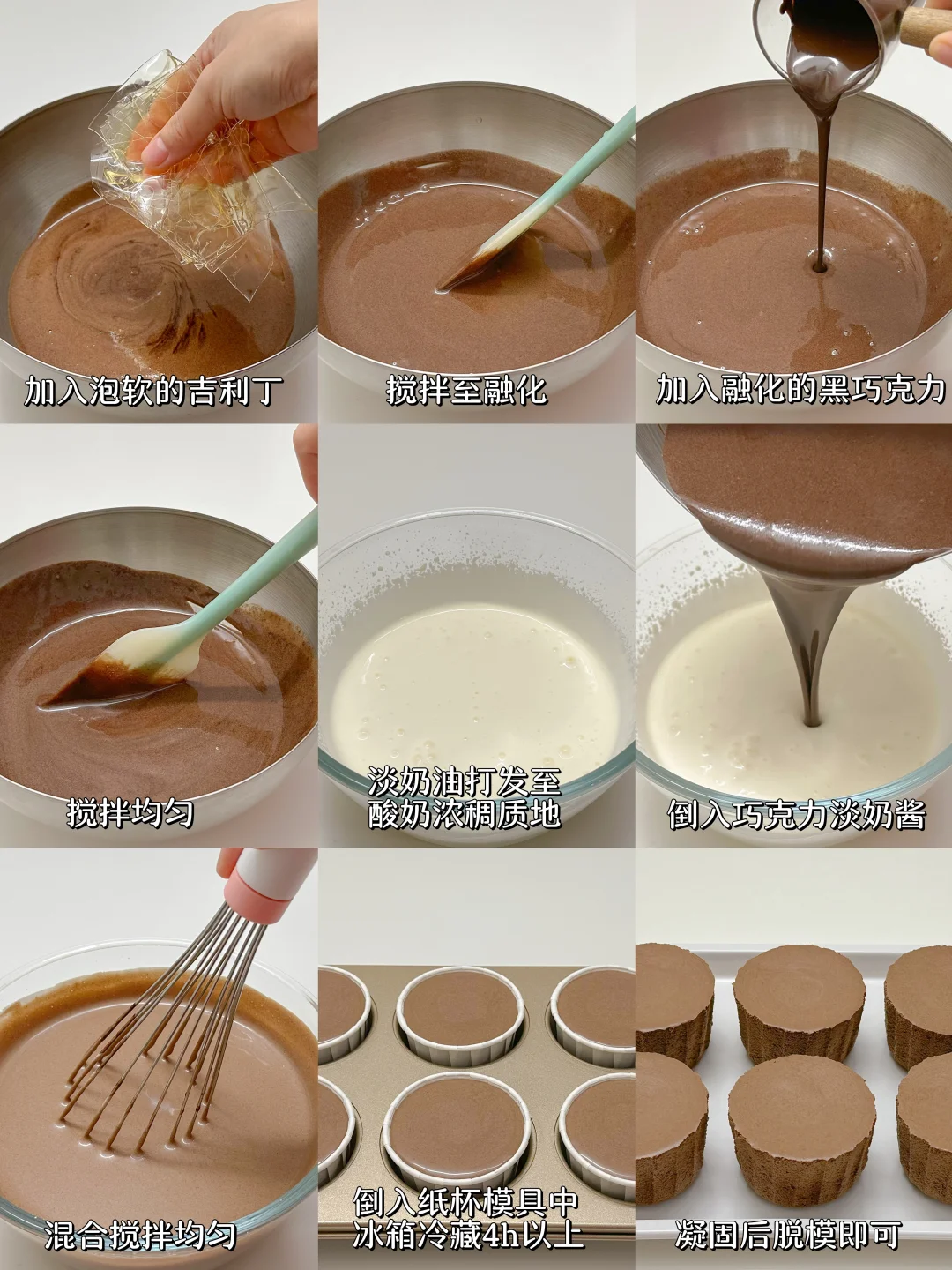 搅一搅就能搞定的巧克力🍫巴巴露亚 入口即可,丝滑浓郁,一口惊艳!![色色R] 比巧克力冰淇淋🍦还好吃 巨满足~😋 免烤箱,只要有一口锅🍳就能搞定! 做法简单,喜欢的赶紧都去试试~💕 🌈食材: 牛奶200g 可可粉18g 蛋黄60g 白糖60g 黑巧克力40g 吉利丁片10g 淡奶油220g 🌈做法: 1️⃣蛋黄加白糖搅拌至发白,锅中加入牛奶和可可粉,小火加热不停搅拌,煮至微沸腾关火,边倒入蛋黄糊中边搅拌均匀,再倒回锅中小火加热不停搅拌至浓稠关火,稍降温后过筛一遍。 2️⃣巧克力淡奶酱加入吉利丁搅拌融化,加入融化的黑巧克力搅拌均匀,淡奶油打发至酸奶浓稠质地,倒入巧克力淡奶酱混合搅拌均匀。 3️⃣把巧克力淡奶酱倒入纸杯模具中,冰箱冷藏4小时以上凝固,凝固后脱模即可。