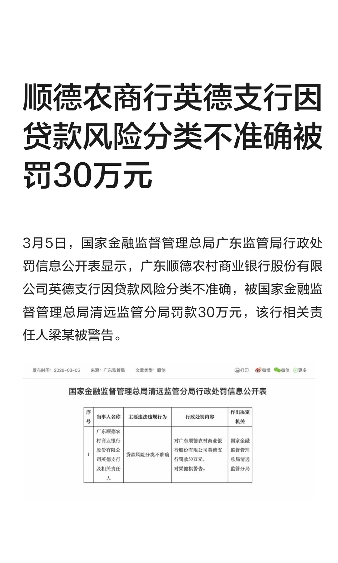 顺德农商行英德支行因贷款风险分类被罚30万