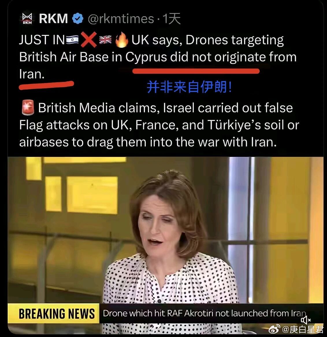 特别有意思的一幕:英国国防部当地时间 3 月 5 日正式发表声明称:确认袭击塞浦路斯阿克罗蒂里皇家空军基地的无人机,并非来自伊朗。英国媒体更是以突发新闻形式发出警告称:以色列运用“假旗行动”攻击英国、法国和土耳其石油设施或空军基地,以便把着这些国家拖入对伊朗的战争中。看到这里,是不是一种恍然大悟的感觉?美东时间3月6日,美中央司令部司令布拉德·库珀高度称赞了仿制伊朗“沙赫德-136”自杀式无人机的表现,称针对“伊朗目标”进行了多次打击。可诡异的是,伊朗那边传出了击落美国MQ-9“死神无人机”,以色列苍鹭、Hermes 900 等王牌无人机,就是没有美国这款山寨自伊朗,模样近乎一致的,改名为“卢卡斯(LUCAS)”的无人机。在布拉德·库珀出席的新闻发布会上,有美国记者追问该无人机主要针对哪些目标,取得哪些战果时,布拉德·库珀对此则讳莫如深,环顾左右而言他,只称“好事”。什么好事呢?英国法国空军基地遭遇“伊朗无人机”袭击,沙特、卡塔尔石油生产设施遭遇“伊朗无人机”袭击,美国驻当地使馆无人时遭遇“伊朗无人机”袭击,阿塞拜疆国际机场遭遇“伊朗无人机”袭击.......这么多袭击后,虽然前面英国官宣,英媒揭露,但是英国斯塔默当局的政策变化,还真体现了这种“好事”。“伊朗无人机”袭击前,英国一直没批准美军使用英国军事基地,特朗普甚至对此雷霆暴怒。“伊朗无人机”袭击后,西方舆论“集体”将矛头指向伊朗,称其为对英国支持美国的 “直接报复”。英国首相斯塔默随后不得不表态,允许美军使用英国基地,只是强调不会参与对伊朗的进攻性打击。沙特、卡塔尔?在“伊朗无人机”袭击,虽然两国之后,在社交媒体上放出了抓捕到准备实施破坏行动的以色列摩萨德特工的消息,但是在美国放出撤离防空系统,频繁遭遇“伊朗无人机”袭击的威胁下,能坚持多久呢?不只是从沙特方离间,还不断给伊朗上眼药。开战前,沙特多层面向伊朗保证不允许从沙特领空,发起对伊朗的军事行动。但是在当地时间3月6日,一架从以色列南部奥夫达空军基地起飞的F-22,竟然“忘记”了关闭ADS-B系统,通过著名航空信息开源网站Flightradar24,向全世界直播了F-22在沙特上空行动的航迹。你说F-22这种关键能力为隐身的战机,其飞行员会这么“健忘”,专门向世界直播自身行动吗?唯一的解释:美以“伊朗无人机”袭击,拉沙特下水阴谋没得逞,那就打脸沙特承诺,把当即原本心知肚明的事,公告天下,看沙特、伊朗如何反应?而沙特?当地时间巴基斯坦当局提醒:巴基斯坦和沙特有共同防御协议。这对美以来说,显然是“好事”。当然最大的“好事”,其实是“伊朗无人机”袭击阿塞拜疆机场后阿塞拜疆的反应——阿塞拜疆阿利耶夫不顾伊朗解释,召开安全委员会会议,并宣布,鉴于“伊朗”通过无人机发动的恐怖袭击,他已向阿塞拜疆武装部队下达命令,要求采取报复措施。阿塞拜疆边境距离伊朗德黑兰首都直线距离仅仅350公里,两国有近700公里地形复杂的边境线,对快速打击、特种渗透、空中突防都有极为显著战术价值。美以已经多次放风要地面入侵伊朗,而快速突进到伊朗首都,最具标志性意义,或产生出乎意料的效果,如激起伊朗内部反对势力起事,从而如委内瑞拉一样,实现对伊朗政权更迭的战略目标。如从波斯湾方向突进,美军现有部队增加到美国伊拉克战争时50万的规模,或许都难以完成;但参考委内瑞拉模式,短距突袭空降,占领控制德黑兰并不是不可能。1月29日,隶属美国空军特种作战司令部MC-130J特种作战运输机,搭载第 160 特种作战航空团(“暗夜潜行者”)精锐部队降落阿塞拜疆首都巴库。2月7日,Flightradar24还曾显示另一架MC-130J再次出现在亚美尼亚空域,向阿塞拜疆方向抵近。这才是布拉德·库珀“好事”的真相。下周,伊朗或许重点要防备的就是来自阿塞拜疆的背刺、突袭;如果能撑过这一波,对美以阿特种行动力量巨大杀伤,那么美以发起的这波战争,特朗普及内塔尼亚胡,将走向溃败,政治生命被终结,甚至自然生命也进入倒计时。但如果被美以特种部队速通了德黑兰,在这里扶持其了反对政权,那么中东石油将落入美国以色列之手,中俄将面临更加恶劣地缘局势。消化伊朗后,美以下一个目标必定是巴基斯坦,和哈萨克斯坦。