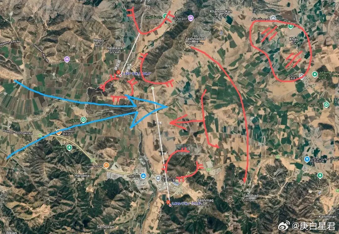 总体局势如图中红蓝线所示,伊朗境内四个控制点、后方一个配置炮兵群的背斜面,刚好躲在山体后侧的一片平原则可以展开反冲击队形。而进攻方展开正面宽度严重不够,最多最多只能展开一个旅级规模的战斗群。