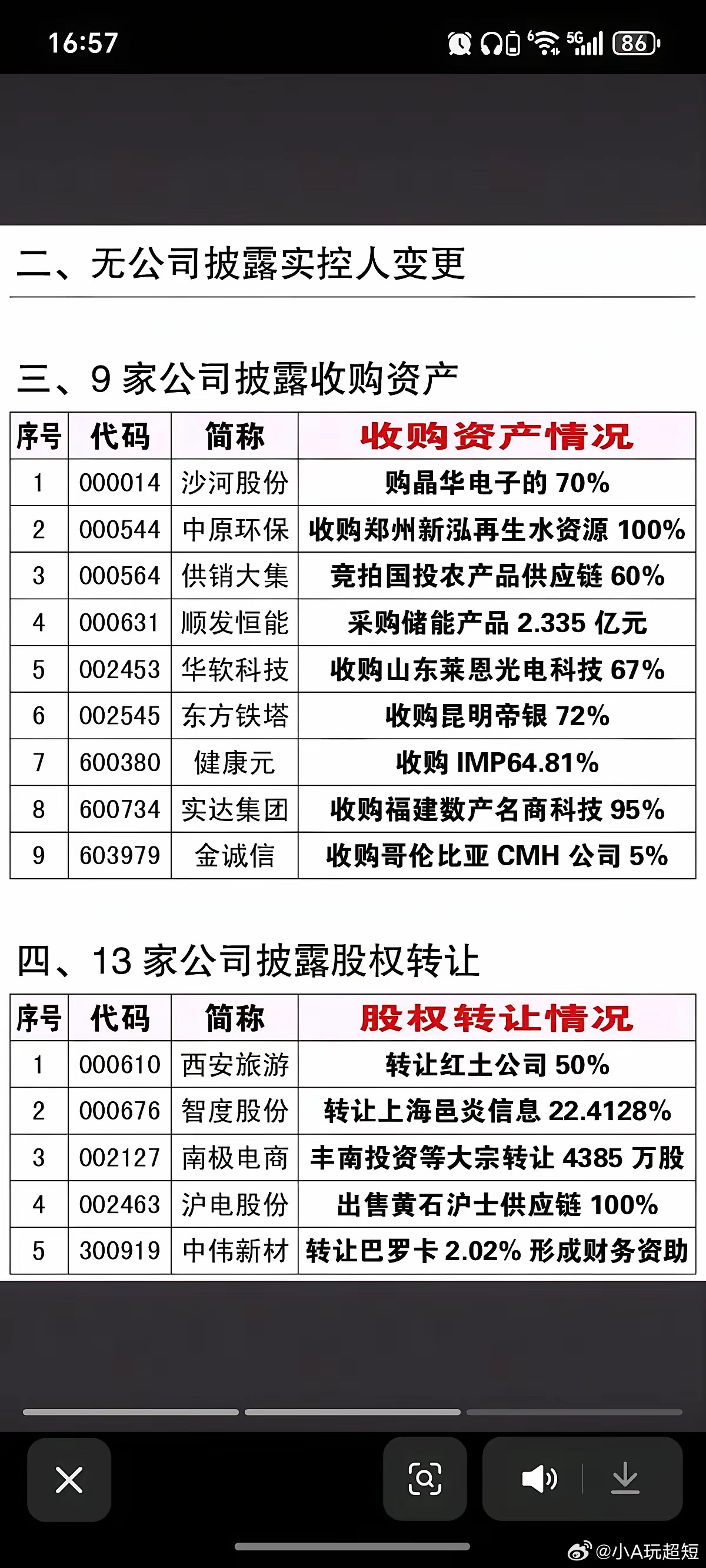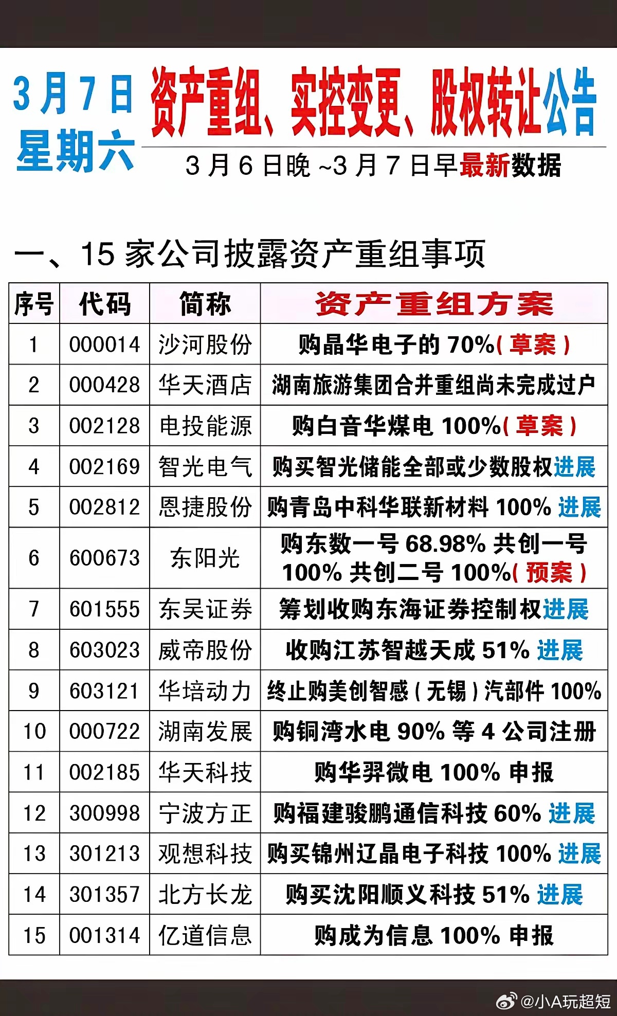 3.7周六 最新:资产重组、股权转让、实控人变更公告!15家公司披露资产重组,其中1家证券公司重组。科技题材重组值得格外关注。13家公司披露股权转让9家公司披露收购资产5家公司披露出售资产
