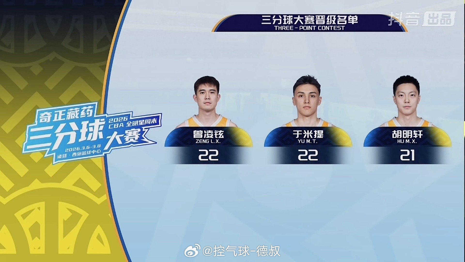2026CBA三分大赛首轮战罢!曾凌铉、于米提双双轰下22分,携手胡明轩晋级决赛!福建黑马对飙山西射手,广东王牌稳扎稳打,谁能捧起三分王奖杯?让我们拭目以待!cba全明星星锐赛cba全明星周末