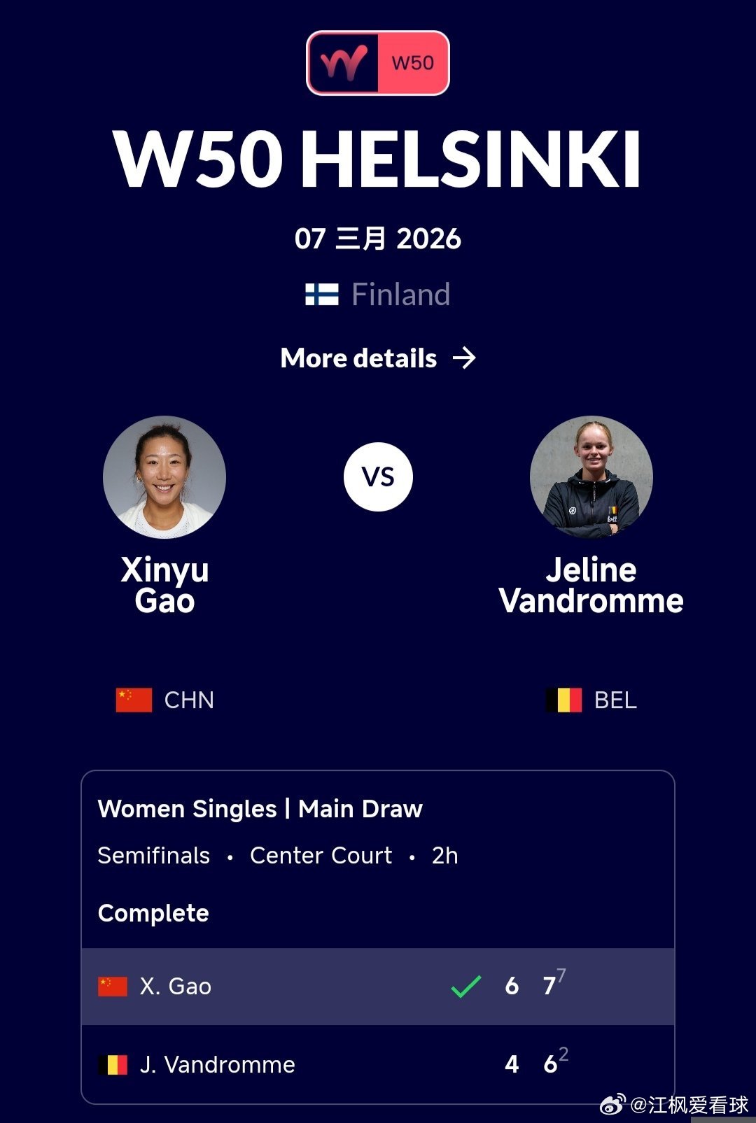 高馨妤🇨🇳6-4/7-6(2)战胜范德罗姆🇧🇪,晋级决赛,恭喜高馨妤!🎉🎉🎉