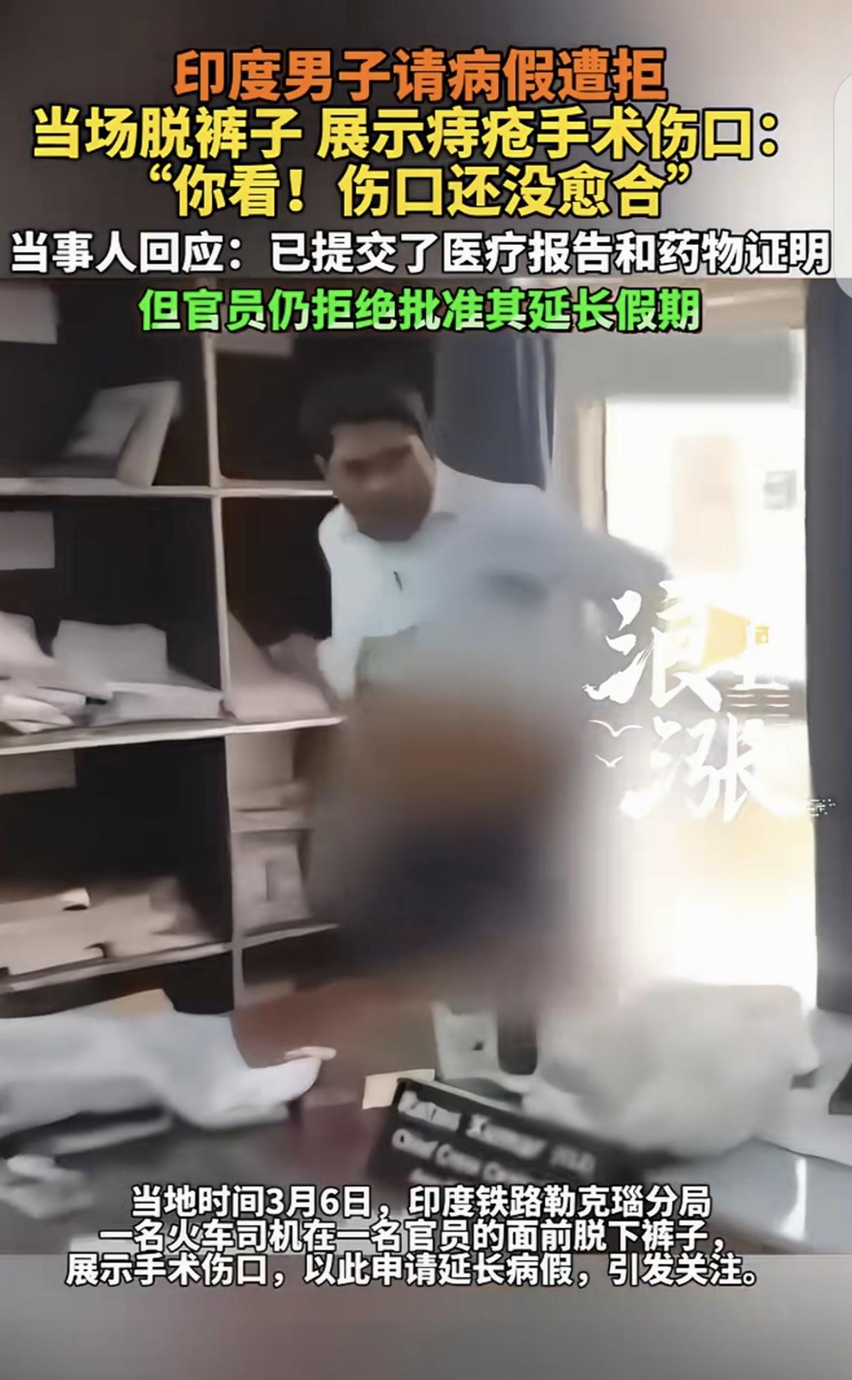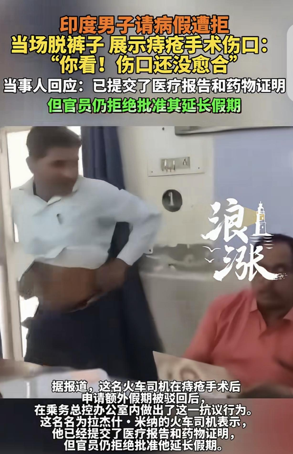 “真是个人才!”一男子是火车司机,他做了痔疮手术,没好利落,不能上班,他提交了医疗报告和药物证明,跟公司申请延长假期,竟被拒绝了。无奈,男子一怒之下来到公司,对着领导当场脱裤子,展示自己的痔疮伤口:你看,还没愈合!网友调侃:只是割个痔疮,又不是截肢,但凡还吊着一口气,都必须要坚守岗位。 男子是印度的一位火车司机,平时,他驾驶着火车穿梭在城市与乡村之间,工作忙碌且责任重大。 可最近,他却遭遇了一件让他又气又无奈的事儿。 这位火车司机做了痔疮手术。这痔疮手术虽不算大手术,但恢复起来可没那么容易,术后他身体虚弱,伤口也疼得厉害,根本没办法正常上班。 他心里想着,自己为公司辛苦工作,现在生病了,公司肯定会理解并批准他延长假期的。 于是,他按照公司的规定,提交了详细的医疗报告,上面清楚地写着他痔疮手术的情况,和目前身体还未恢复、需要继续休养的诊断结果。 同时,他还附上了药物证明,证明自己正在接受治疗。他希望公司能批准他的申请,让他能安心养病。 毕竟,他压根无法坐在驾驶室座位上,屁股一挨座椅,疼的他冷汗直流。 万万没想到,公司竟然拒绝了他的延长假期申请。 这让火车司机十分困惑和愤怒,他想不明白,自己明明有医疗证明,身体也确实没好,为什么公司就不能通融一下呢? 他多次找领导沟通,可领导总是以各种理由推脱,就是不同意他延长假期。 男子心里又急又气,身体的不适加上工作的压力,让他几乎崩溃。 愤怒之下,男子做出了一个大胆又无奈的举动。 他怒气冲冲地来到公司,直接冲到领导面前,在众目睽睽之下,当场脱下了裤子,把自己的痔疮伤口展示给领导看,大声说道:“你看,还没愈合!”周围的人都惊呆了,领导也一脸尴尬。 这件事很快就在网上传开了,大家们纷纷调侃,这是个有味道的视频,领导那意思,只要没截肢,坚守岗位。 虽然网友的话带着玩笑的成分,但也反映出大家对这件事的看法。 从公司的角度来看,或许有工作安排等方面的考虑,但在员工生病需要休养的时候,也应该多一些人文关怀。 毕竟,员工是公司发展的基石,只有员工身体健康,才能更好地为公司创造价值。 而这位火车司机,也是被逼无奈才出此下策,他只是想得到应有的休息和照顾。 这位火车司机的遭遇,实在让人哭笑不得。 他因痔疮手术未愈无法上班,按流程提交证明申请延长假期,本是合理诉求,却被公司无情拒绝。 公司领导以各种理由推脱,全然不顾员工实际身体状况,这种做法实在缺乏人情味。 从员工角度看,火车司机为公司辛苦付出,生病时渴望得到照顾,这是人之常情。 身体不适还要强撑工作,不仅影响工作质量,还可能危及自身安全,甚至影响整个火车运行的安全。 公司只考虑工作安排,忽视员工健康,无疑是短视行为。 从公司角度,虽可能有运营压力,但也不能以此为借口牺牲员工权益。 员工是公司发展的核心力量,只有保障他们的健康和权益,才能激发工作积极性,为公司创造更大价值。 这次事件也给其他公司敲响警钟,在管理时要兼顾制度与人文关怀,不能顾此失彼。 法律规定,用人单位未按照劳动合同约定提供劳动保护或者劳动条件的,劳动者可以解除劳动合同。 在此案例中,公司拒绝员工合理休假申请,未提供适宜劳动条件,侵犯了员工权益,员工有权维护自身合法权利。 对此,你怎么看?