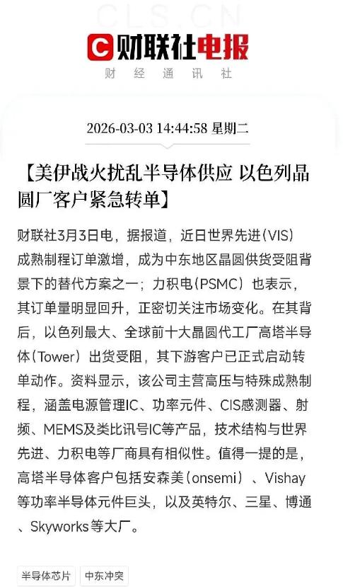 中东一打仗,芯片圈立马就炸了。以色列最大的晶圆厂高塔半导体,现在出货卡壳了,这下热闹了。别小看这家厂,它做的不是手机里那种顶尖芯片,而是汽车、工业设备里离不开的“工业味精”。   它不跟台积电、三星拼3nm、5nm的先进制程,专攻模拟芯片、射频模块、功率器件这些看似普通却不可或缺的产品,就像做菜少不得的味精,少了它们,汽车跑不起来,工业设备转不动,就连高端科技产品也得停摆。   高塔半导体的核心竞争力藏在特色工艺里,其中高端硅锗(SiGe)芯片的全球产能占比超70%,这种能实现300GHz以上超高频传输的芯片,是5G通信、卫星通信和光模块的核心部件。   更关键的是,它的硅光子工艺直接支撑着英伟达1.6T光模块的量产,而这正是AI算力集群急需的关键硬件。   除了这些高端应用,汽车上的电源管理芯片、工业设备的传感器、医疗成像的CMOS器件,都是它的主力产品,覆盖的领域看似零散,却个个都是产业链的“刚需环节”。   它的客户名单堪称半导体行业的“全明星阵容”,英特尔的射频模块、三星的传感器、安森美的功率半导体,还有博通、Skyworks这些通信芯片巨头,都依赖它的产能。   甚至连松下的高端传感器、英伟达的光模块配套芯片,要么直接下单,要么通过下游厂商间接采购,形成了一张看不见的依赖网络。   这些客户之所以离不开它,核心在于特色工艺的技术壁垒——这类芯片不需要最先进的制程,但对工艺稳定性、材料兼容性的要求极高,换一家代工厂就意味着重新进行长达数月甚至数年的认证,没人敢轻易冒险。   中东冲突的爆发,直接击中了这家工厂的两大命门。   首先是生产端的不确定性,以色列本土产线面临安全风险,员工到岗、设备运行都受到影响,原本稳定的产能直接“卡壳”。   更要命的是物流运输,波斯湾航线受阻后,亚欧货运不得不绕行非洲好望角,单航次运输时间从25-30天拉长到40-50天,延误时间高达10-14天。   芯片属于高附加值、时效敏感的产品,这种延误直接导致下游厂商的库存预警,而海运运价飙升和运力紧张,又进一步增加了交付成本。   连锁反应很快蔓延开来,下游大客户纷纷启动紧急转单,中国台湾的世界先进、力积电成了主要接收方。   但转单远非换个供应商那么简单,成熟制程和特色工艺的芯片有严格的认证周期,新产线需要重新调试设备、优化流程,还要通过车规、工控级的可靠性测试,这个过程短则数月长则一年。   更现实的是,全球成熟制程的特色工艺产能本就紧张,2025年相关产能利用率一直维持在90%以上,突然涌入的急单让替代厂商的产能瞬间饱和,不少客户只能排队等待,交付周期直接拉长数周。   冲突带来的隐忧还不止于此。   芯片制造离不开关键原材料,伊朗供应着全球18%的氖气,这种气体是光刻环节的必需材料,一旦供应中断,将直接冲击全球半导体产能。   而高塔半导体在以色列的工厂是其核心产能之一,虽然它在美国、日本也有产线,但技术重心和高端产能仍集中在本土,短期很难快速转移。   这就形成了一个棘手的局面:客户想转单却没足够产能承接,工厂想恢复出货却受限于地缘冲突,整个产业链陷入了“想换换不了,想等等不起”的困境。   这场风波也暴露了全球芯片供应链的脆弱性。   长期以来,行业都在关注先进制程的垄断问题,却忽略了成熟制程和特色工艺的“隐形瓶颈”。   像高塔这样的细分领域龙头,虽然全球市占率不算顶尖,却在特定技术路线上形成了不可替代的地位。   这种“单点依赖”在和平时期看似稳定,一旦遇到地缘冲突、自然灾害等突发情况,就会引发连锁反应。   说到底,高塔半导体的“卡壳”就像一面镜子,照出了全球产业链深度融合下的潜在风险。   那些看似不起眼的细分龙头,往往握着产业链的“关键钥匙”。   这场风波之后,相信更多企业会意识到供应链多元化的重要性,不再把鸡蛋放在一个篮子里。   而对于普通消费者来说,可能短期内感受不到直接影响,但背后产业链的调整和博弈,最终会通过产品价格、交付周期等方式,慢慢显现出来。   全球芯片圈的这场“震动”,本质上是对现有供应链体系的一次压力测试,而测试的结果,将深刻影响未来几年行业的布局逻辑。