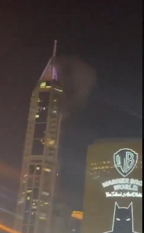 【迪拜传来一声巨响。 据报道,包括深受游客欢迎的迪拜码头区在内的迪拜多个地区都听到了爆炸声。 一架伊朗无人机似乎撞上了迪拜的 23 Marina 摩天大楼——浓烟从 88 层冒出。】