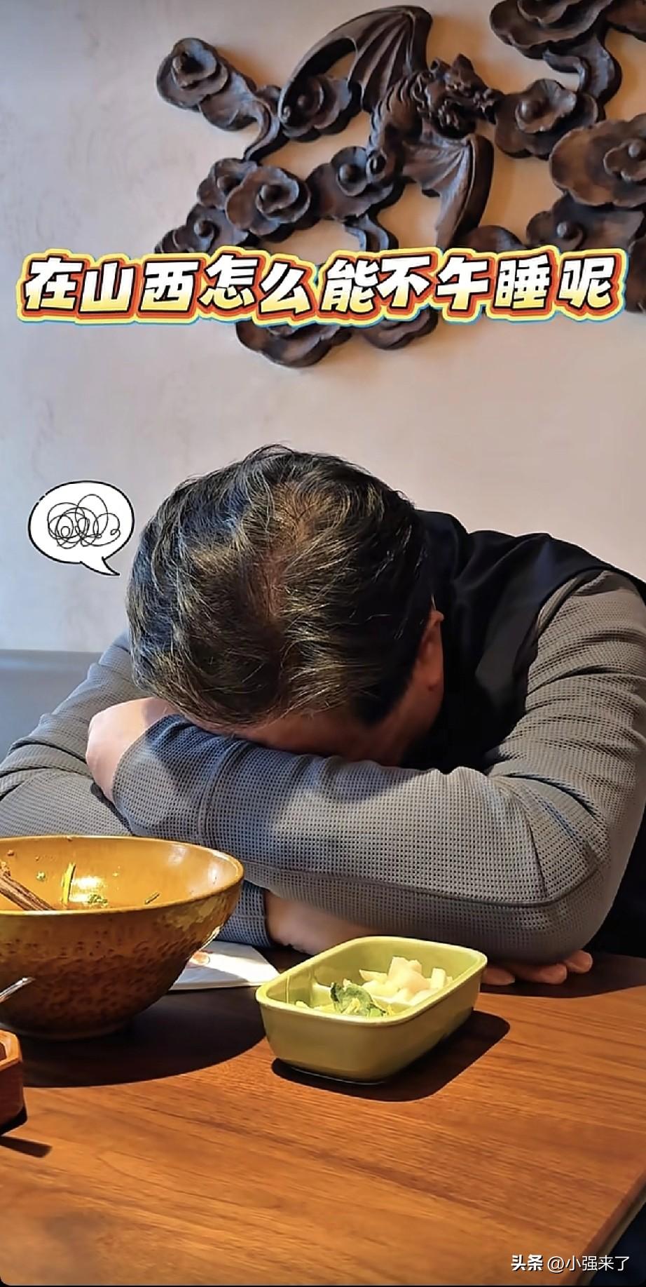 近日,家住在北京的演员刘金山去了山西太原游玩,通过几天的感受,找到了当地人爱睡午觉的原因之一[捂脸]。视频开头,说了一句,上天入地之,我最爱吃面,走在街上,各种招牌面,玲琅满目,于是分别品尝了“剔尖面”,“肥肠剔尖面”,“西红柿鸡蛋刀削面”,“老太原打卤面”,“肉末刀削面”,量很大,很大。特点每次都是吸溜的方式进食,而且连汤都喝了[机智]。也就是说,这几天的面食,让刘金山吃完饭之后,直接趴在桌子上睡觉,俗称晕碳了[惊呆]。各位山西老铁,你们喜欢午睡,和这个有关系吗?