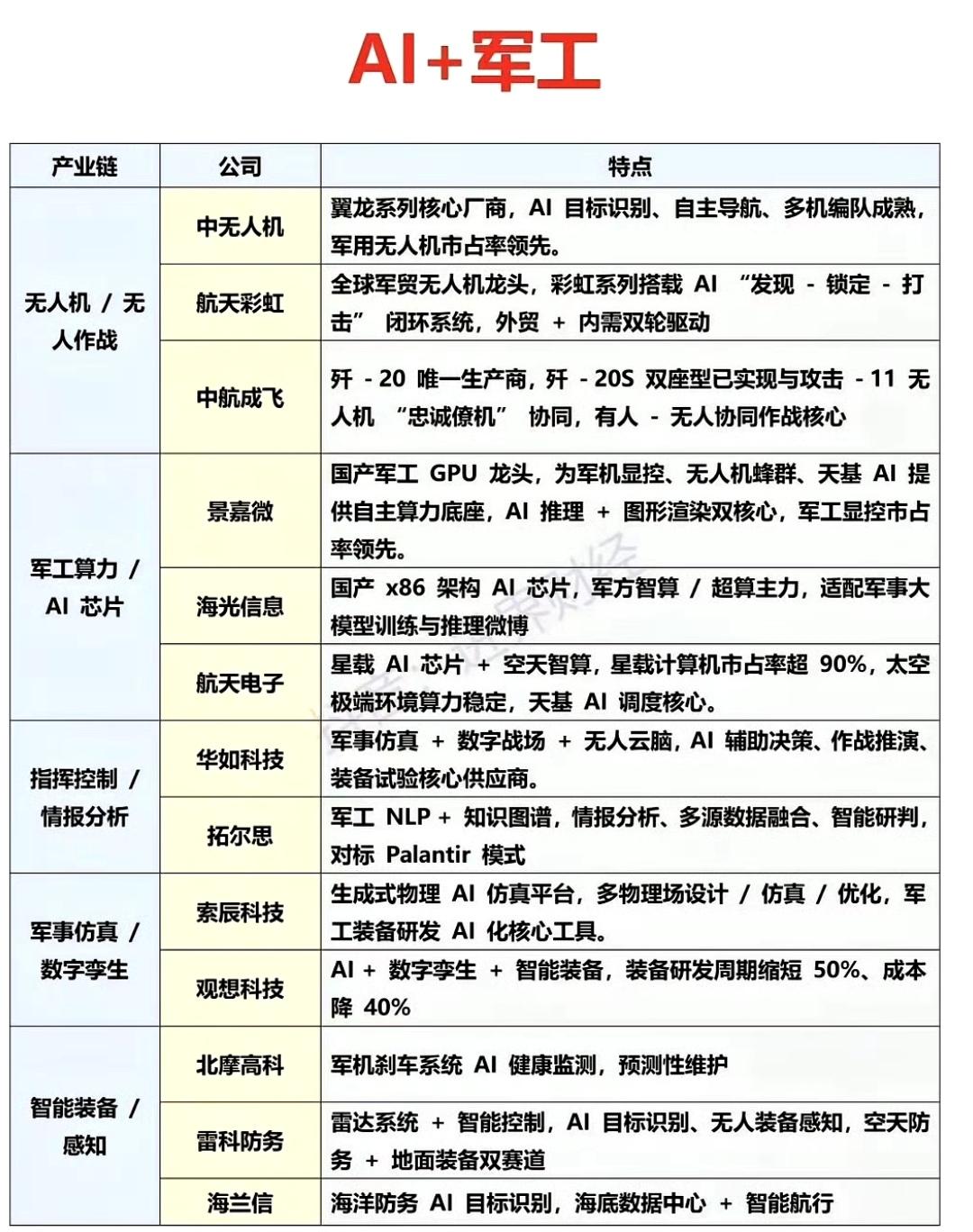 “AI+军工”能否成为未来科技的大热门? 在现代战争演变中,技术革命一次次重塑军事版图,如今人工智能成了关键变革点。 过去十年我国军队着重“信息化”,构建了C4ISR系统。但如今信息洪流让决策速度跟不上战场变化,“智能化”就成了必然趋势。 国盛证券也说AI+军工是大势所趋,“制智权”是制胜关键,俄乌冲突都被称为“人工智能第一战”。 AI军工产业链分上、中、下游。上游的基础先收益,中游算法、模型等是核心,下游应用场景广阔。