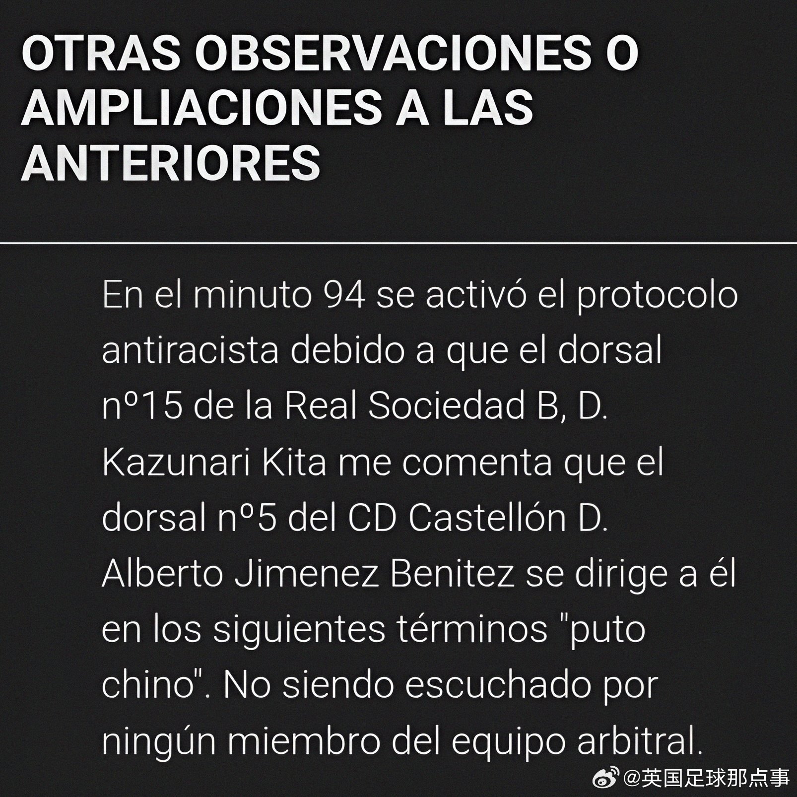 队报:西班牙赛场再现种族歧视事件。西班牙第二级别联赛比赛中,效力于皇家社会B队的日本球员北一成指控卡斯特利翁球员阿尔贝托·希门尼斯在比赛中称他为“该死的中国人”。
