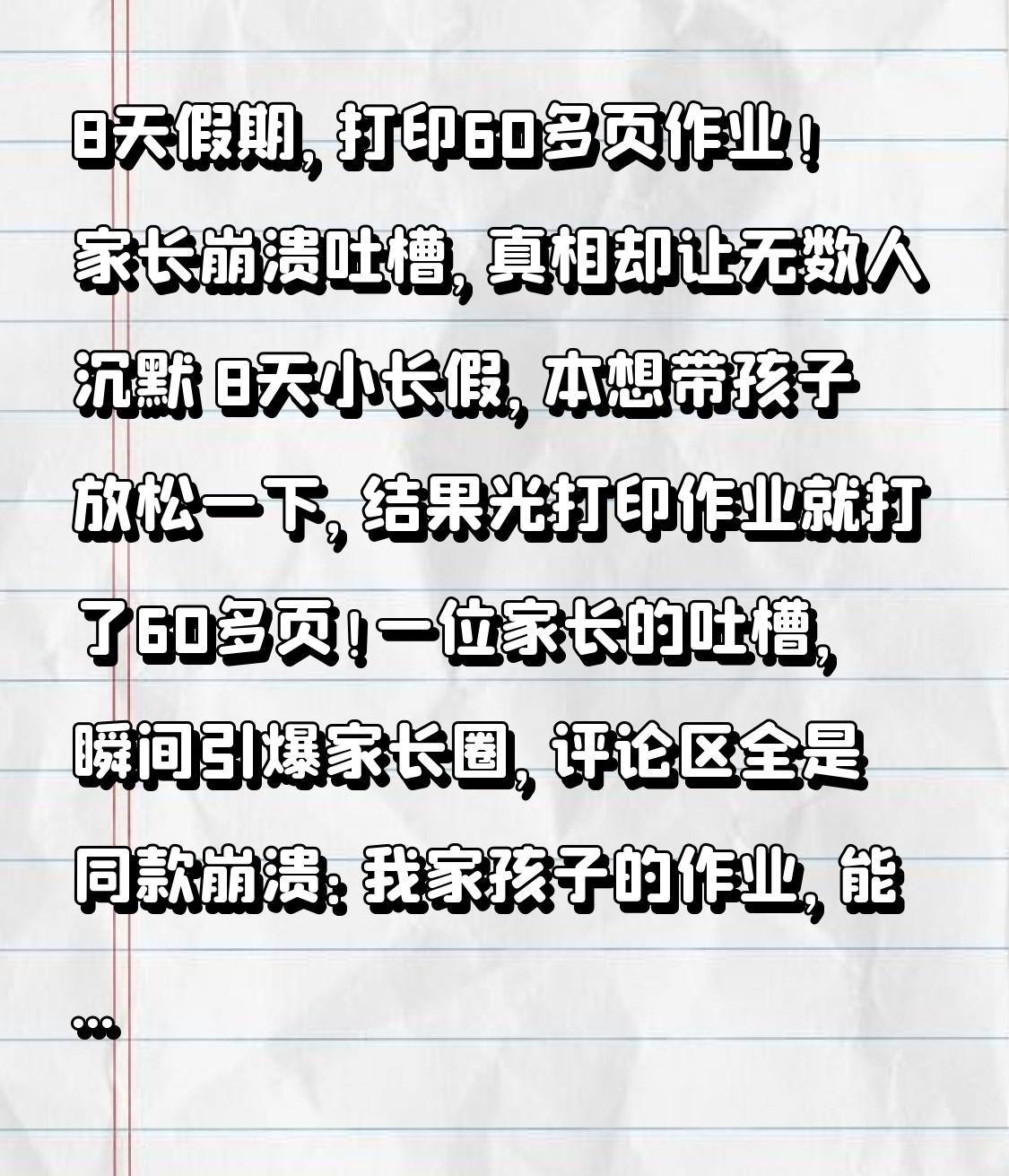 8天假期,打印60多页作业!家长崩溃吐槽,真相却让无数人沉默 8天小长假,本想带孩子放松一下,结果光打印作业就打了60多页!一位家长的吐槽,瞬间引爆家长圈,评论区全是同款崩溃:我家孩子的作业,能堆成小山! 假期本该是休息、陪伴、长见识的日子,可现在的孩子,放假比上学还累。早上7点起床写作业,晚上11点还在刷题,试卷、练习册、手抄报、手工、背诵打卡,一项接一项,压得孩子喘不过气,家长也跟着熬。 60多页作业,孩子要一笔一划写完,家长要陪着检查、签字、打印、装订,一天下来,大人孩子都精疲力竭。不少家长抱怨:假期作业到底是给孩子留的,还是给家长留的?减负喊了这么多年,怎么越减越多? 就在大家集体吐槽作业太多时,事情迎来了转折点! 有老师道出真相:60多页作业,并非全是强制必写,其中一半是分层作业、选做题,还有拓展阅读、实践任务,老师本意是让孩子自主选择,劳逸结合。可家长们怕孩子落后、怕老师批评,不敢让孩子少写,只能逼着孩子全部完成,硬生生把“选做题”变成了“必做题”。 更扎心的是,很多孩子熬夜写的作业,开学后老师根本没时间批改,大多只是翻一翻、打个勾,大量的重复抄写、机械刷题,不仅没效果,还消磨了孩子的学习兴趣,让孩子越来越厌学。 其实,假期的意义从来不是填满作业,而是让孩子休息、阅读、运动、感受生活。过度的作业,不仅累垮孩子,也消耗亲子关系,最后得不偿失。 我们都希望孩子优秀,但优秀从来不是靠堆作业堆出来的。少一点焦虑,多一点理解,给孩子一点喘息的空间,也给自己一点放松的时间。 8天假期60页作业,你家孩子中招了吗?评论区聊聊你的假期作业烦恼,点赞收藏,愿所有孩子都能拥有轻松快乐的假期!