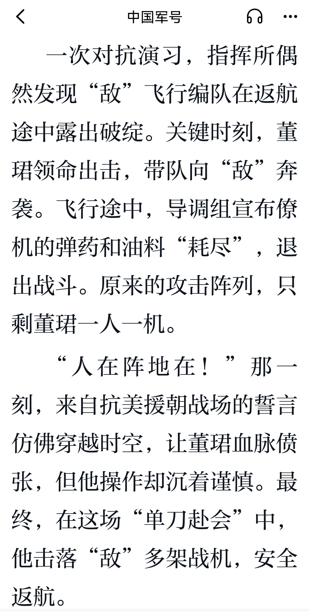 一次对抗演习,指挥所偶然发现“敌”飞行编队在返航途中露出破绽。关键时刻,董珺领命出击,带队向“敌”奔袭。飞行途中,导调组宣布僚机的弹药和油料“耗尽”,退出战斗。原来的攻击阵列,只剩董珺一人一机。他沉着谨慎操作,最终,在这场“单刀赴会”中,他击落“敌”多架战机,安全返航。