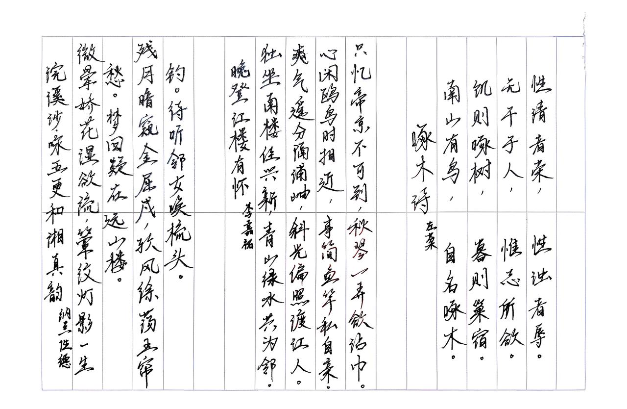 闲来无事练练字。 清朝纳兰性德的《浣溪沙·五更和湘真韵》 唐朝李嘉祐的《晚登江楼有怀》 魏晋时期的左棻(fen)的《啄木诗》 除了纳兰性德出名点,其他两个诗人,我都没怎么听过。 搜了一下后,这个左棻让我有点意外,竟然是个被司马炎征召入宫的妃嫔。 因为相貌平平不受宠,才改而修才修德,但似乎也没留下很多诗作作品。 可惜了!