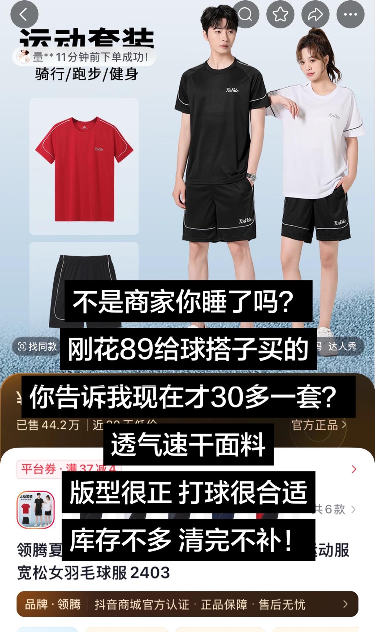 不是商家你睡了吗? 刚花89给球搭子买的 你告诉我现在才30多一套? 透气速干面料 版型很正 打球很合适 库存不多 清完不补!