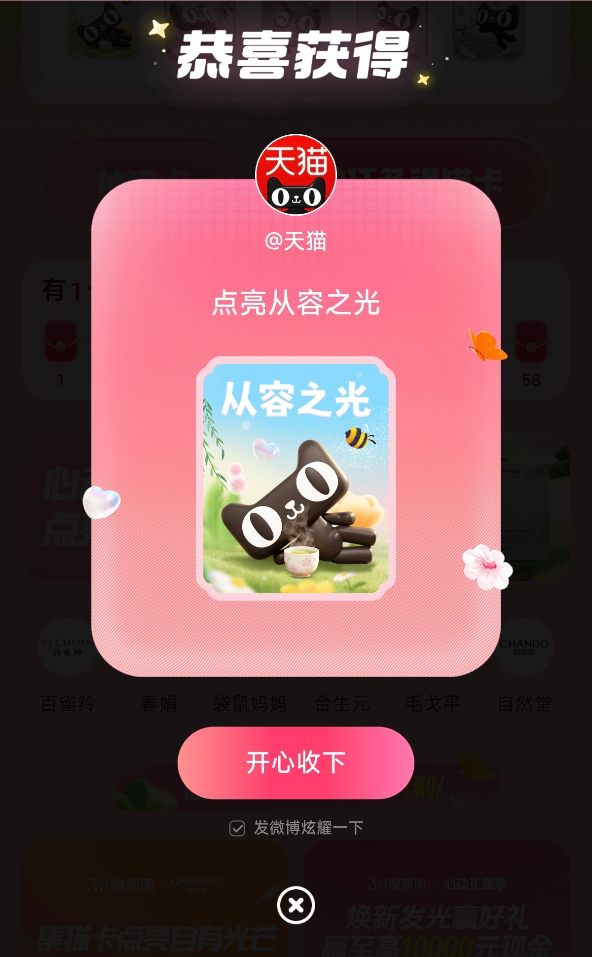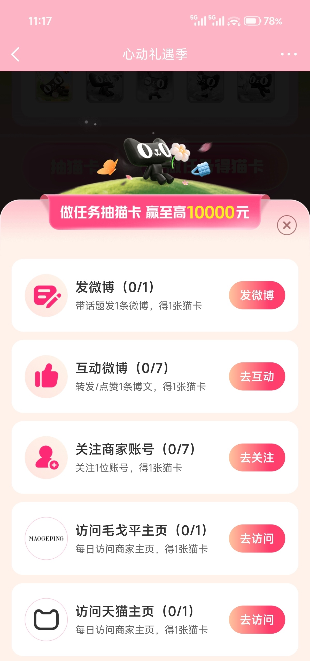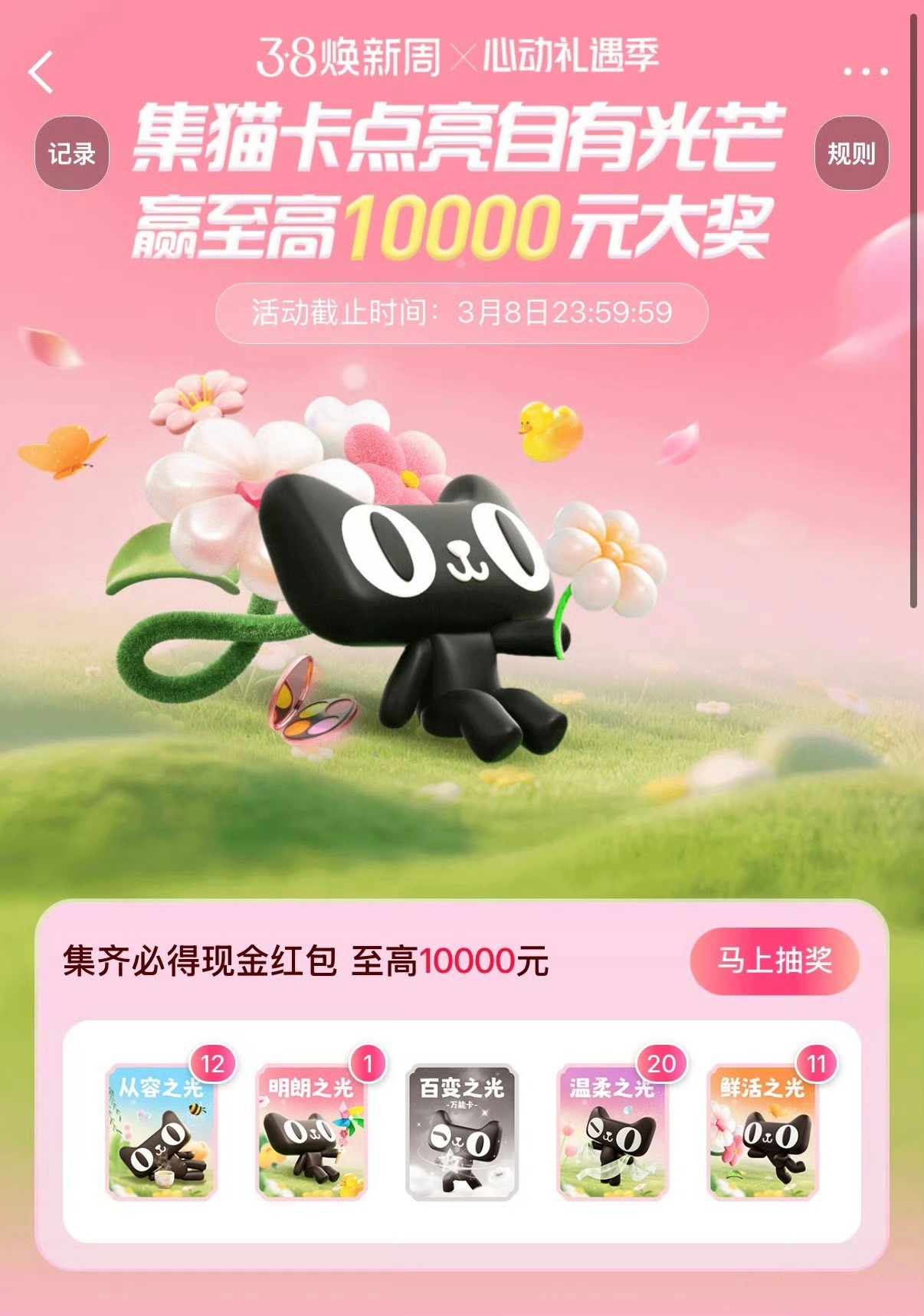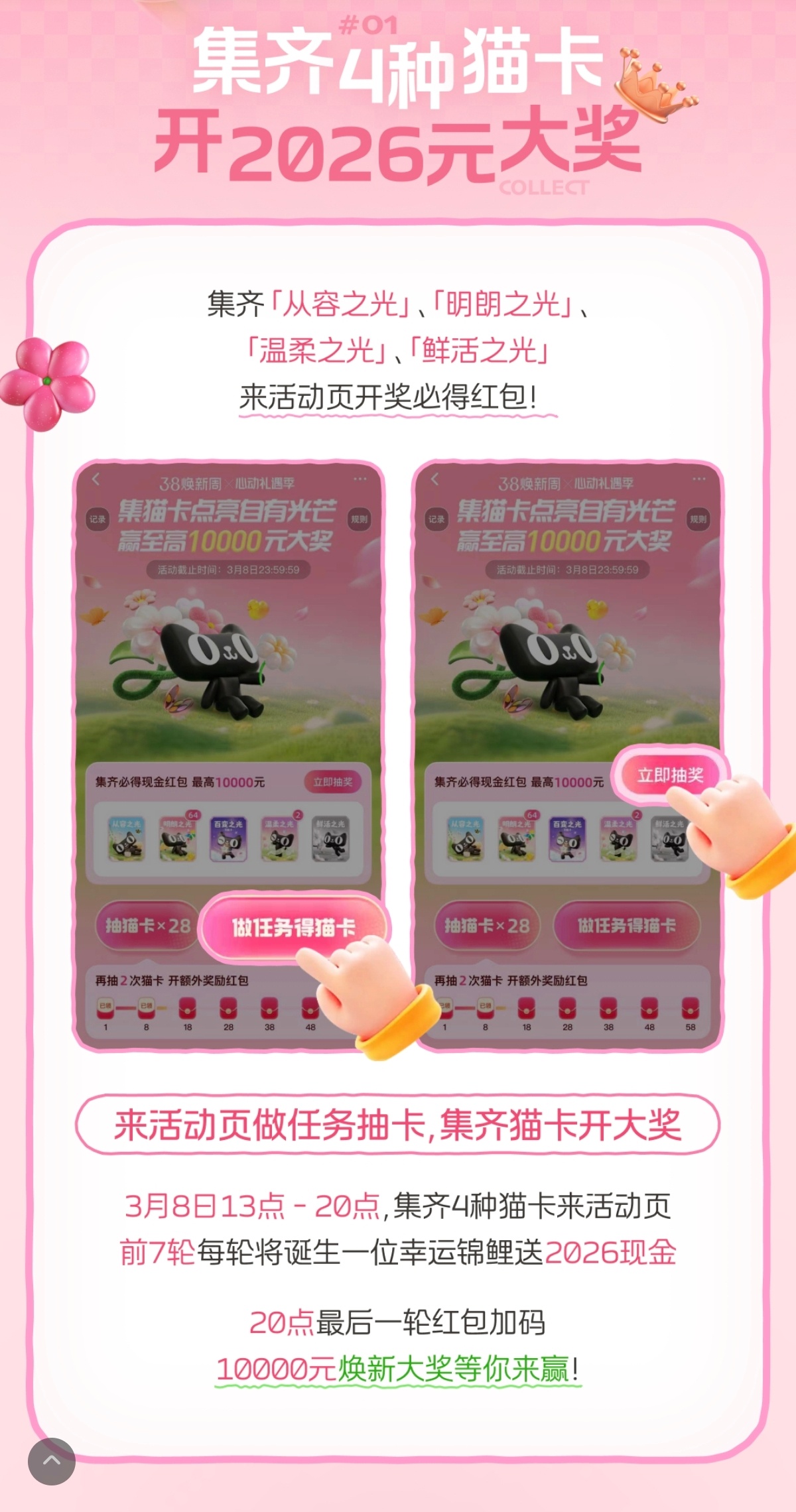 具体来说大家通过参与活动可抽出四款主题猫卡(道具卡),集齐四款必得红包,从下午1点开始,前7轮每轮送出2026元锦鲤奖。