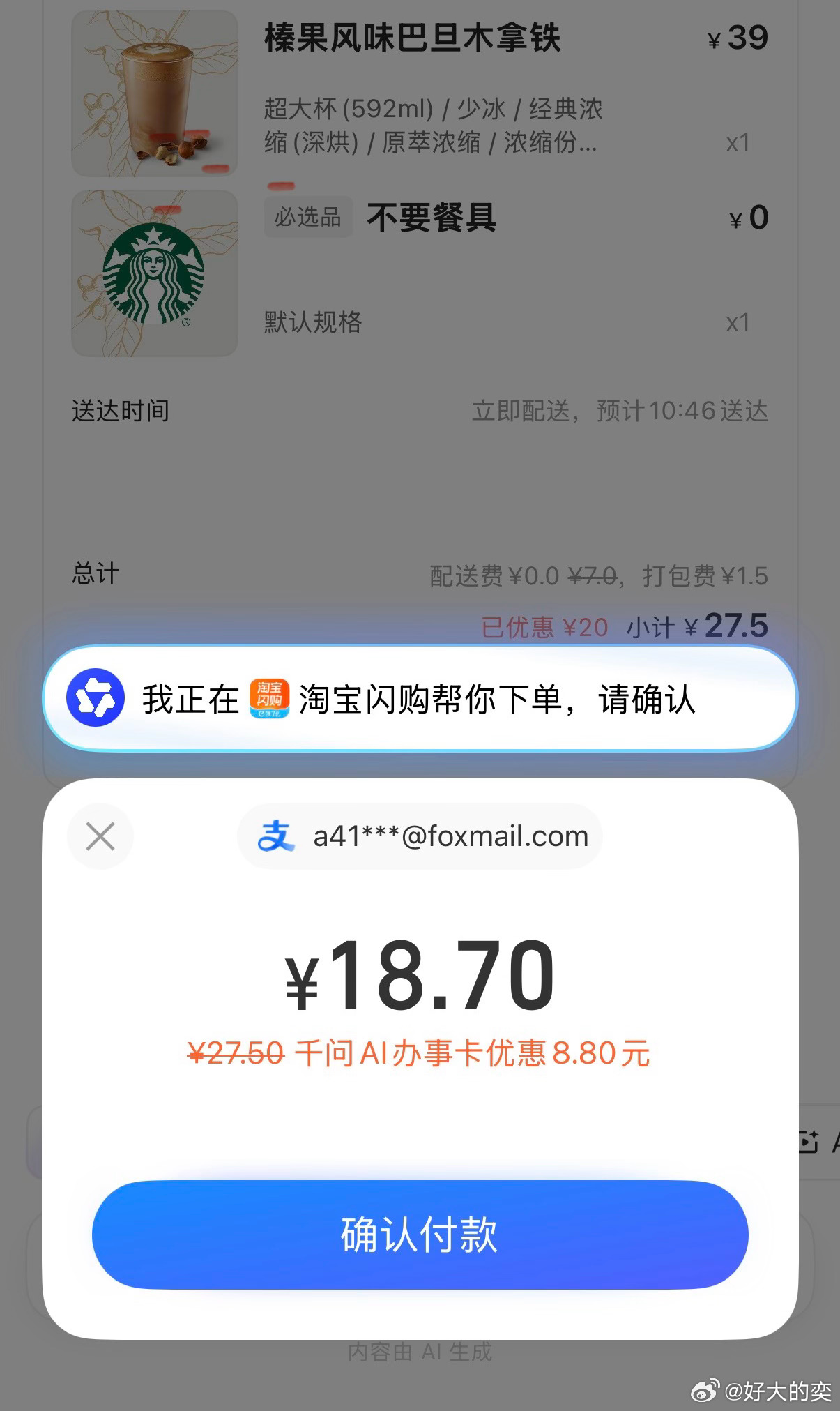 哇,千问今天38妇女节的立减力度真大。点星巴克超大杯给我减了一半。