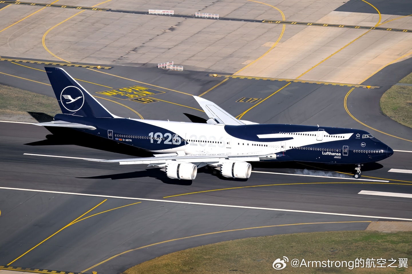 全机身采用深蓝色涂装。机身侧面印有醒目的“100”字样,并带有“1926 | 2026”年份标识。机腹也喷涂了巨大的“100”字样,以便在起降时从地面清晰可见。