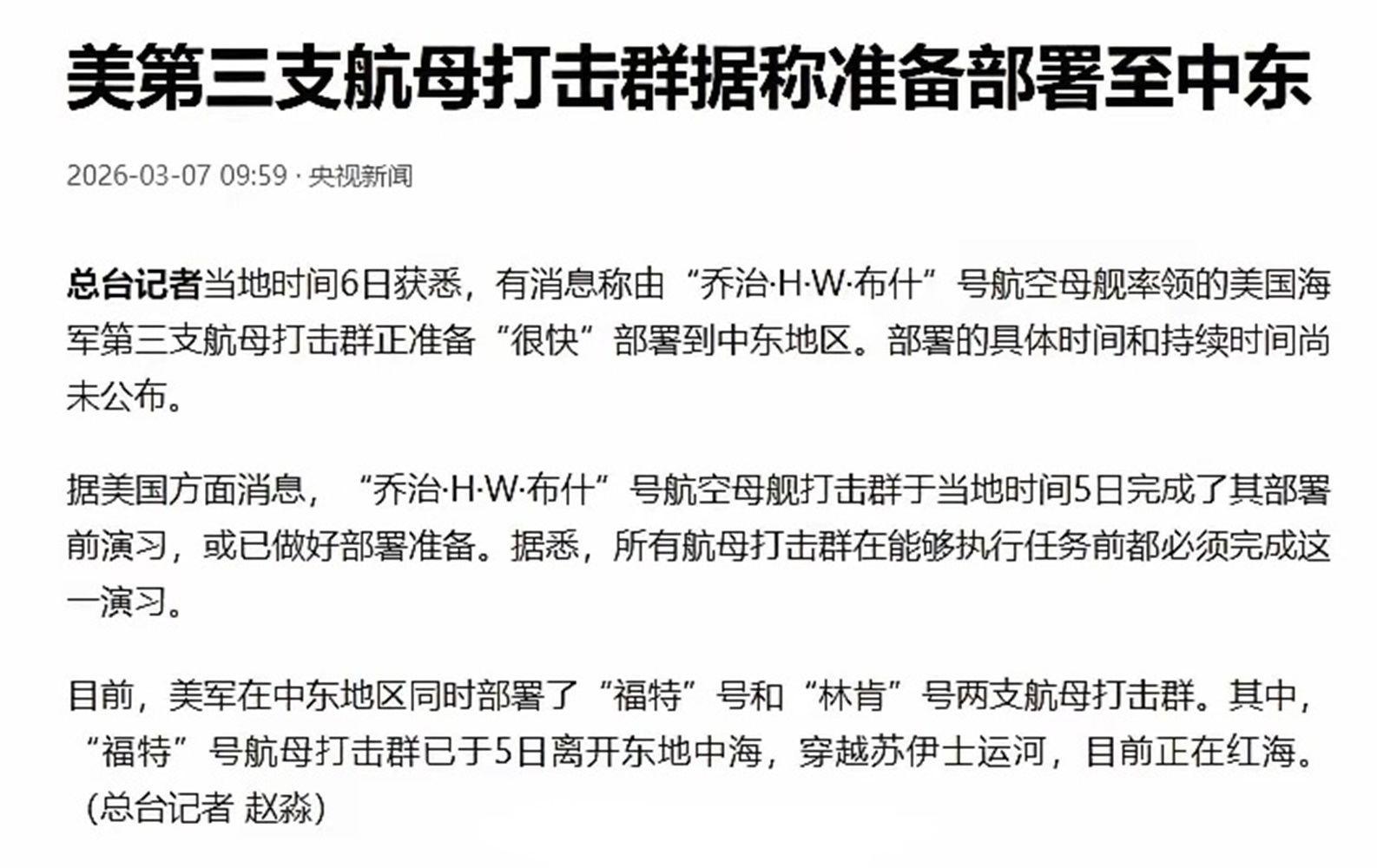 美媒报道,美国海军“布什”号航母即将前往中东地区,加入对伊朗的打击任务,这也是美国派出的第三艘航母。