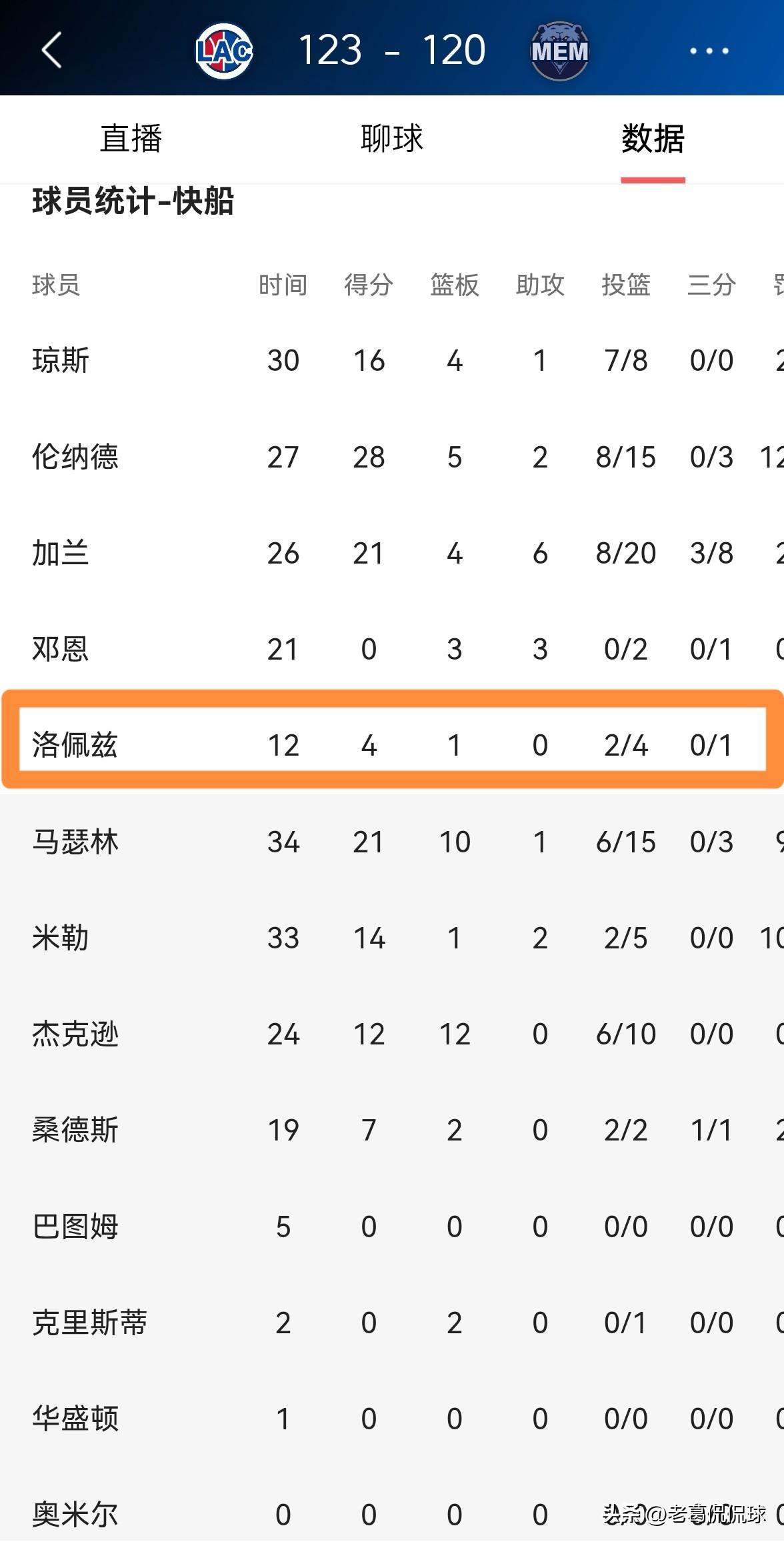 快船老将洛佩兹真是太郁闷了!虽然今天快船在客场以123:120险胜灰熊,但是洛佩兹却打得非常郁闷,此役洛佩兹由于在防守端表现糟糕,因此他仅仅出战了12分钟。 全场比赛下来,洛佩兹首发出战12分钟,投篮4中2,其中三分球1中0仅仅得到4分1篮板,他的场上正负值为-1。 总体来说,本场比赛洛佩兹在场上是毫无存在感的,他在第二节和第三节比赛中没有获得任何的出场机会。