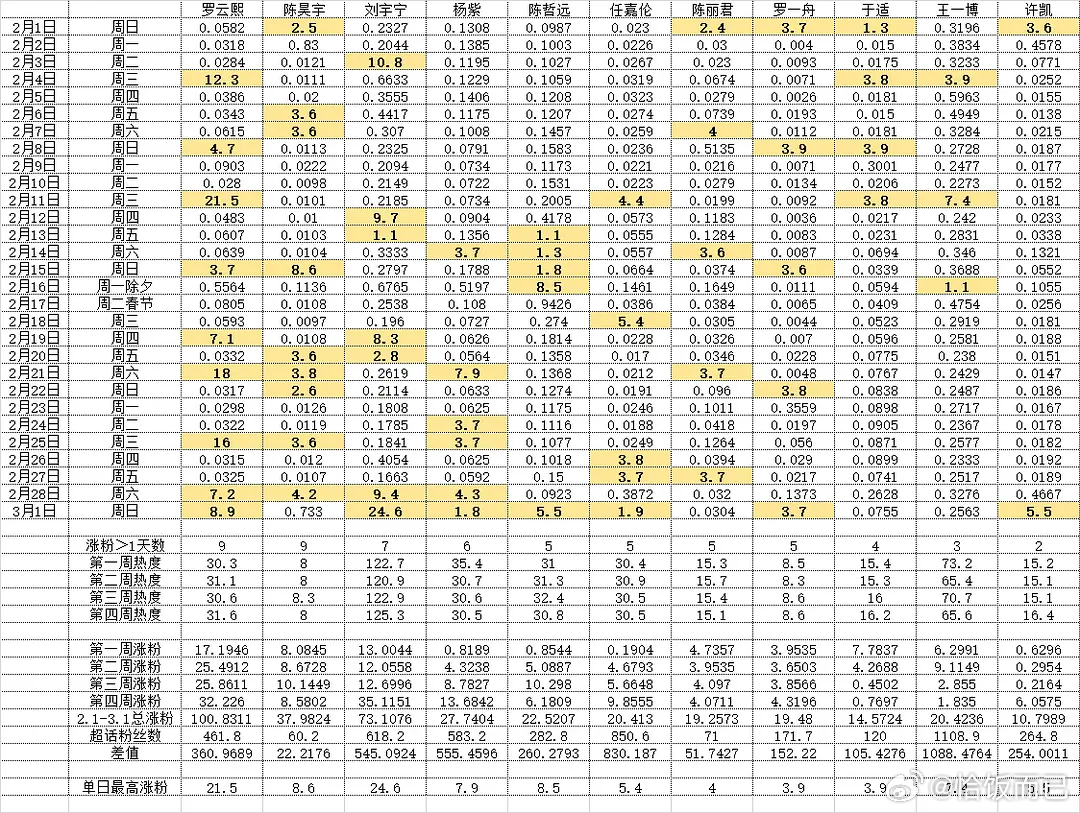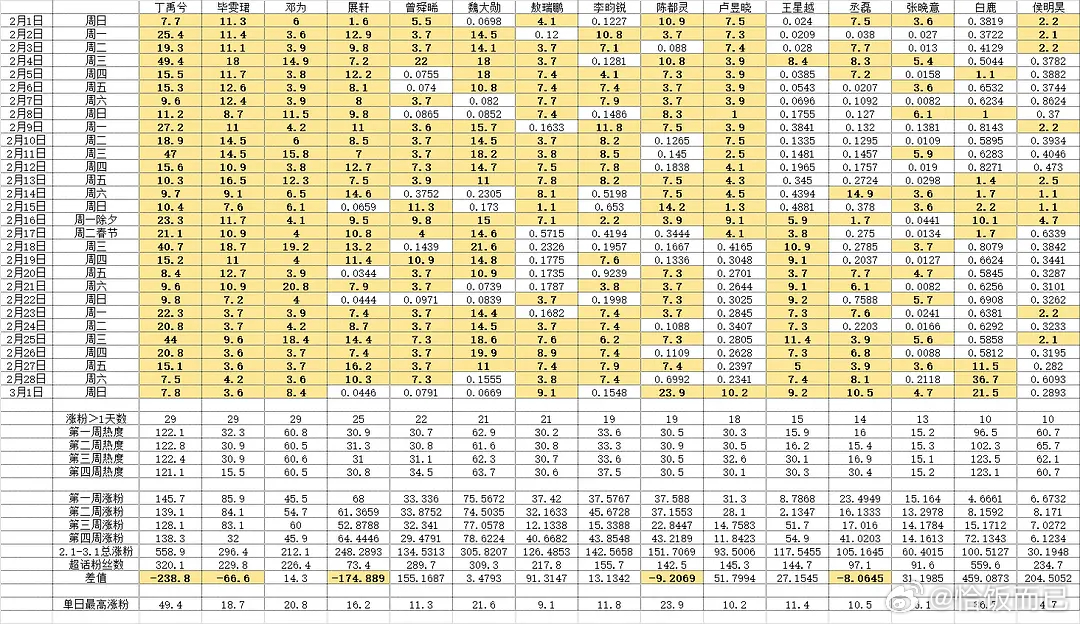 寒假档涨粉TOP10:丁禹兮 558.9万魏大勋:305.8万毕雯珺:296.4万展轩:248.29万邓为:212.1万陈都灵:151.71万李昀锐:142.57曾舜晞:134.5万敖瑞鹏:126.49万王星越:117.55万