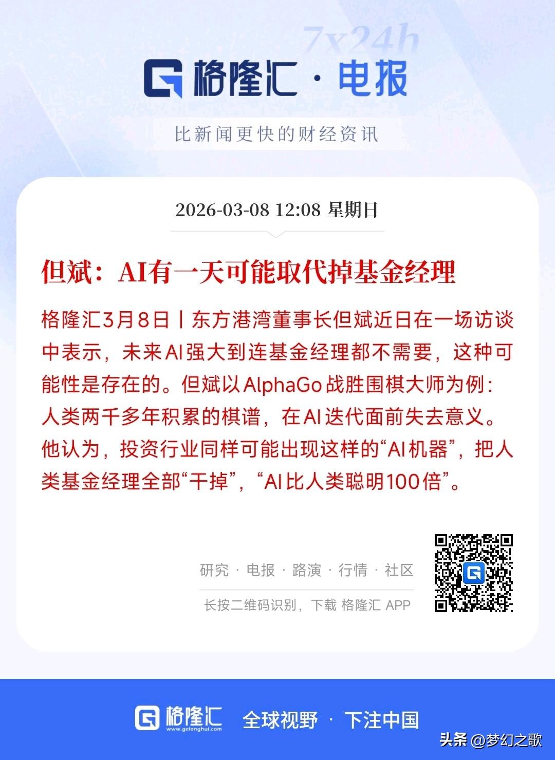 基金经理要被替代了?那未来都是智能的 知名投资人表示:未来基金经理可以会被替代,而替代者就是AI机器人。 这是一个颠覆性的推断,如果AI替代了基金经理,那么基金就跟量化一样了,是不是交易的频率就会变快,不再是长线投资,更加注重的就是数据的分析和短期的盈利。 从现在看人工智能还无法替代基金经理,主要就是基金主要是对板块的投资,而且是长期的,这一定需要前期很大的调研工作,而人工智能的数据分析无法做到对未来产业的预测。