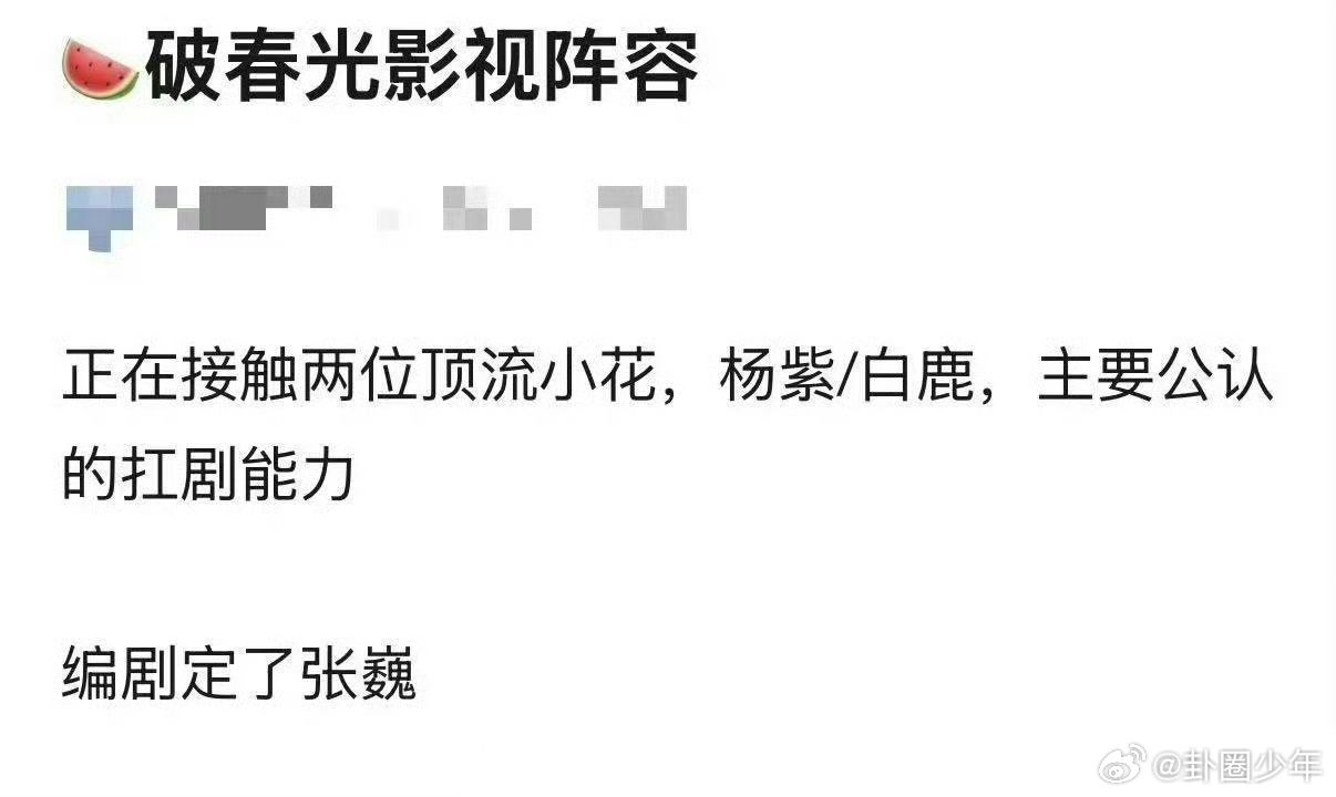 网传破春光接触杨紫和白鹿曝破春光接触杨紫和白鹿非遗英歌大女主剧《破春光》筹备,网传剧组正接触杨紫、白鹿两位实力扛剧花,你更期待谁出演女主?