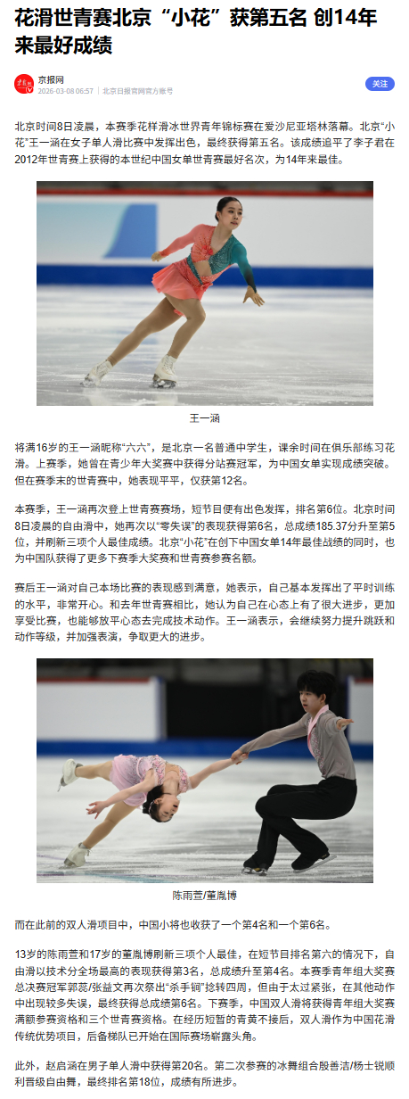 王一涵 六六 2026世青电子剪报图1 北京青年报:北京小花王一涵创14年来女单最佳战绩图2 北京日报:花滑世青赛北京“小花”获第五名 创14年来最好成绩2026年世界青少年花样滑冰锦标赛