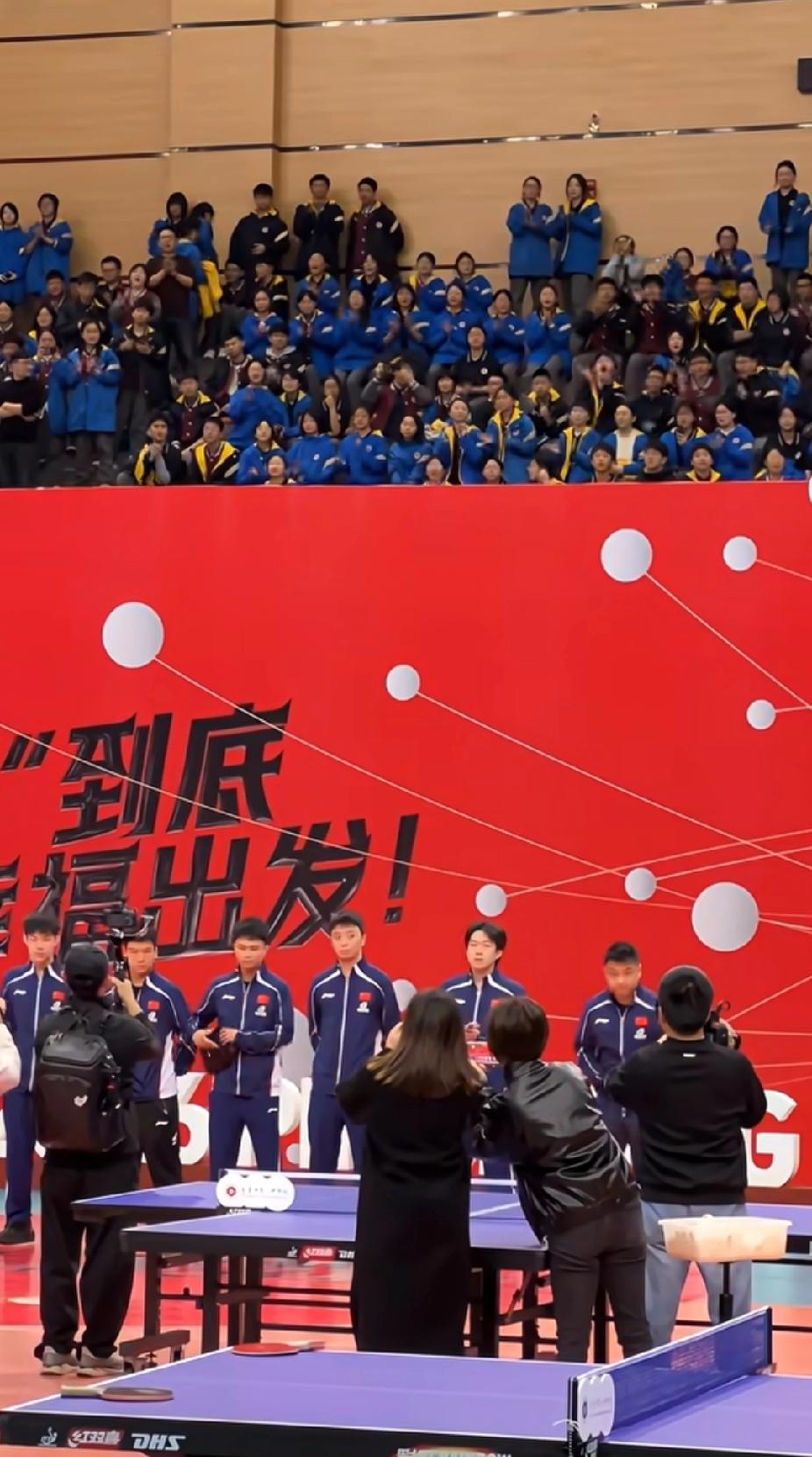 谁懂啊!今天重庆八中的师生们也太幸福了吧!😭 今天上午,备战WTT重庆冠军赛的国乒男队,在王皓、孙逊教练的带领下,走进了重庆渝北八中。王楚钦、梁靖崑、温瑞博、黄友政、陈垣宇、向鹏、徐瑛彬、周启豪……几乎是男队的半壁江山都来了! 看这现场,王楚钦还在台上挥手,台下的同学们都沸腾了!能和自己的偶像近距离接触,甚至切磋球技,这是什么神仙运气啊!真的要狠狠羡慕这些师生了,今天的校园,就是追星成功的大型现场! 国乒进校园 WTT重庆冠军赛 王皓 王楚钦 重庆八中