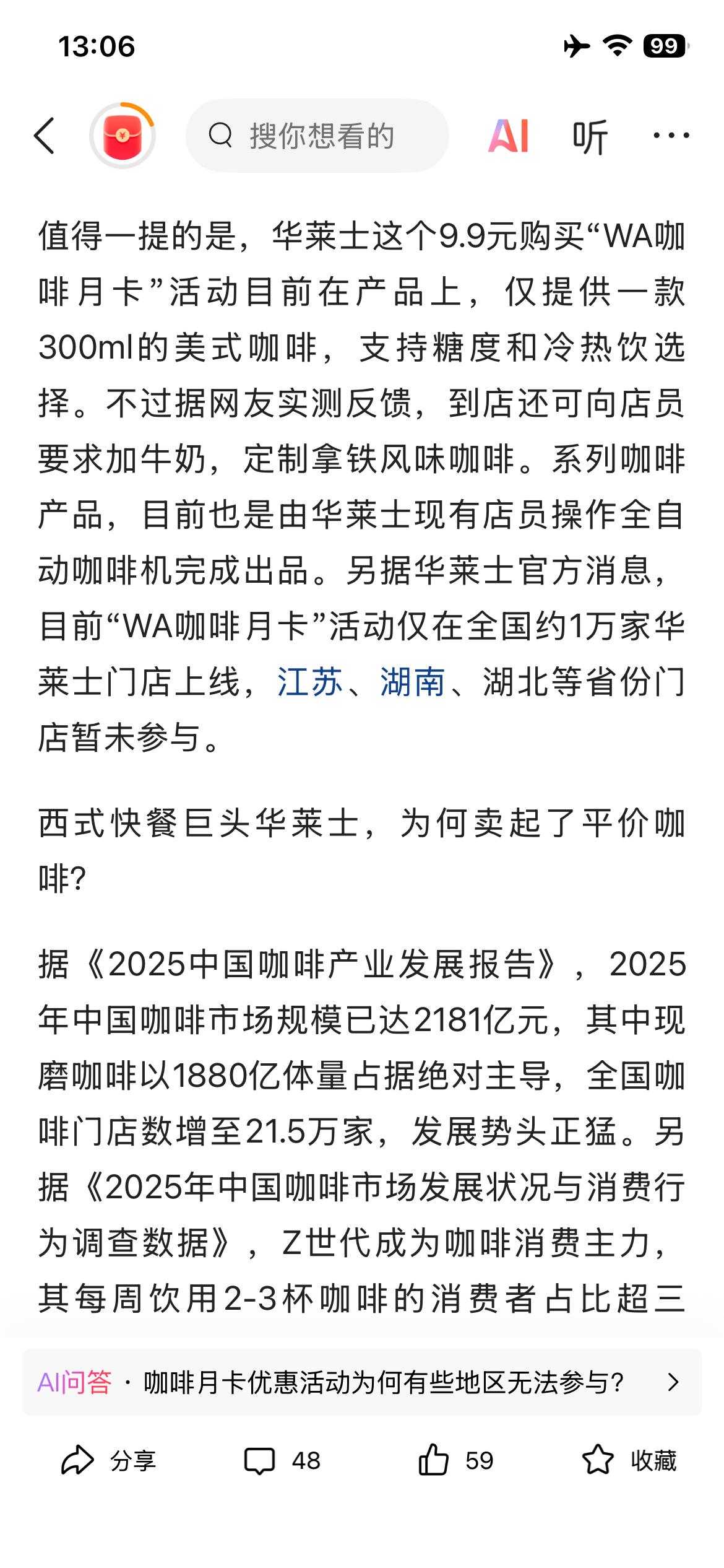 另辟蹊径!这真的是买汉堡送咖啡了。中国的咖啡市场很大,包月咖啡方式,深度挖掘了“咖啡消费诉求盲区”。把咖啡战场从城级,细化到镇级,从而重新培育咖啡用户依赖路径。瑞幸抢占了上班群体,星巴克拥有了小资群体,华莱士通过“咖啡全家桶”方式,确实巧妙绕开了风险。在中国乡镇市场,有很大一部分人是不单点咖啡的,包月咖啡能否撬走雪王、瑞幸的部分客户,持续的规模化投入很关键,后续动作,值得关注学习。