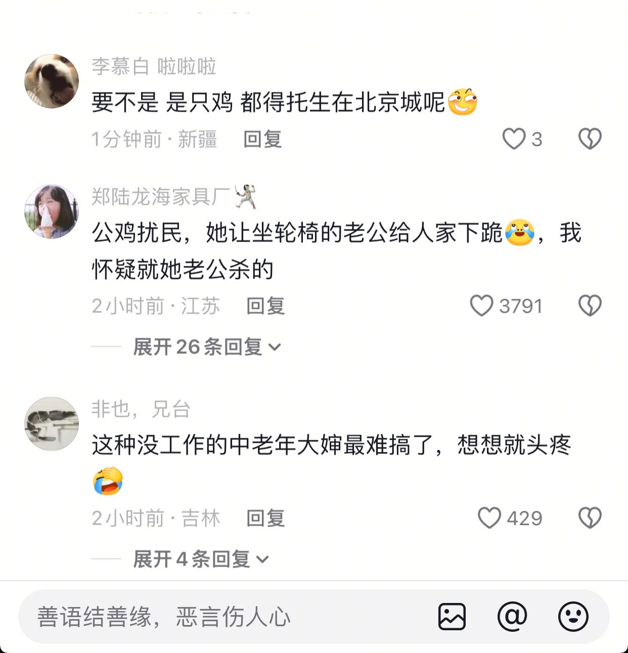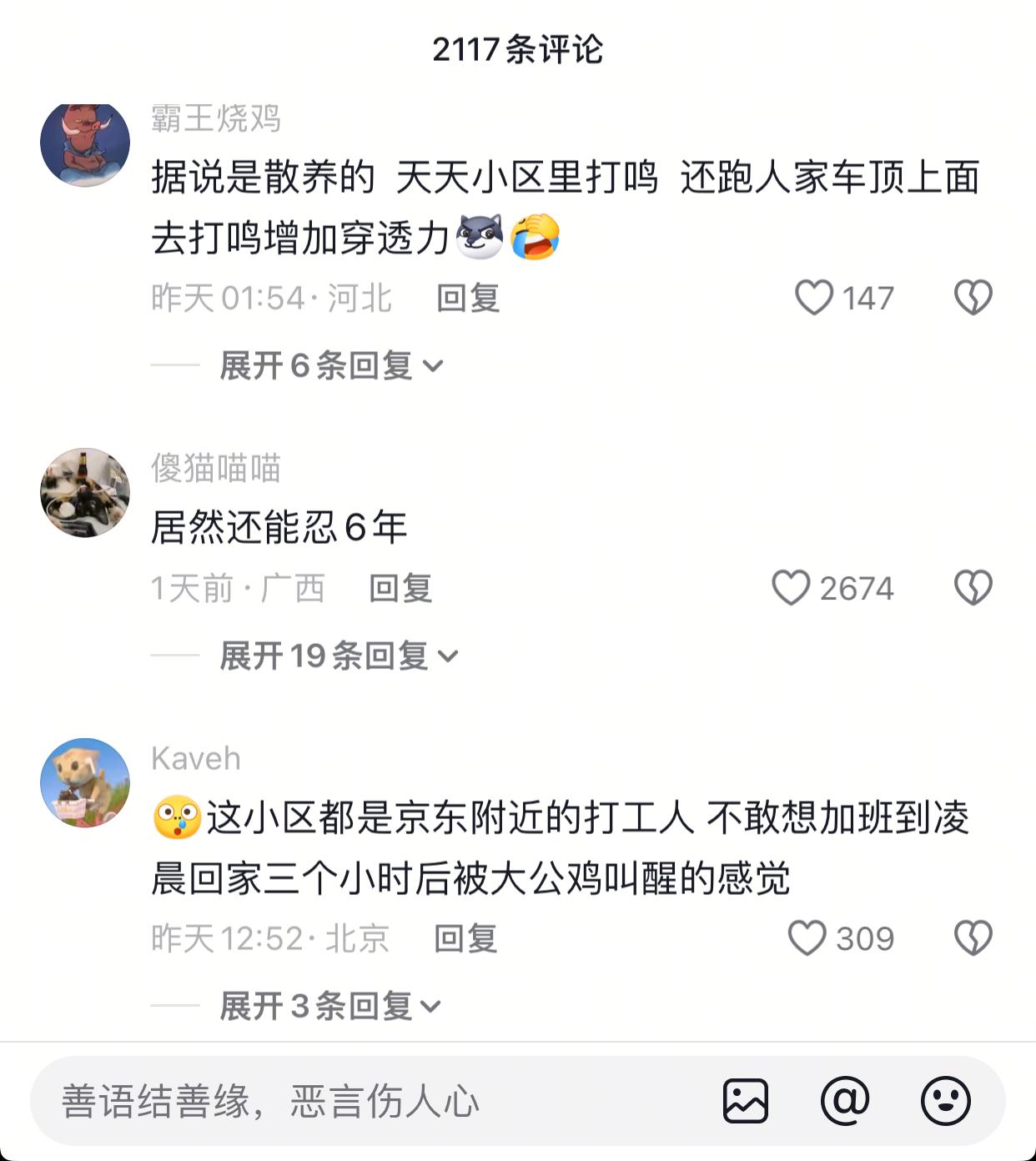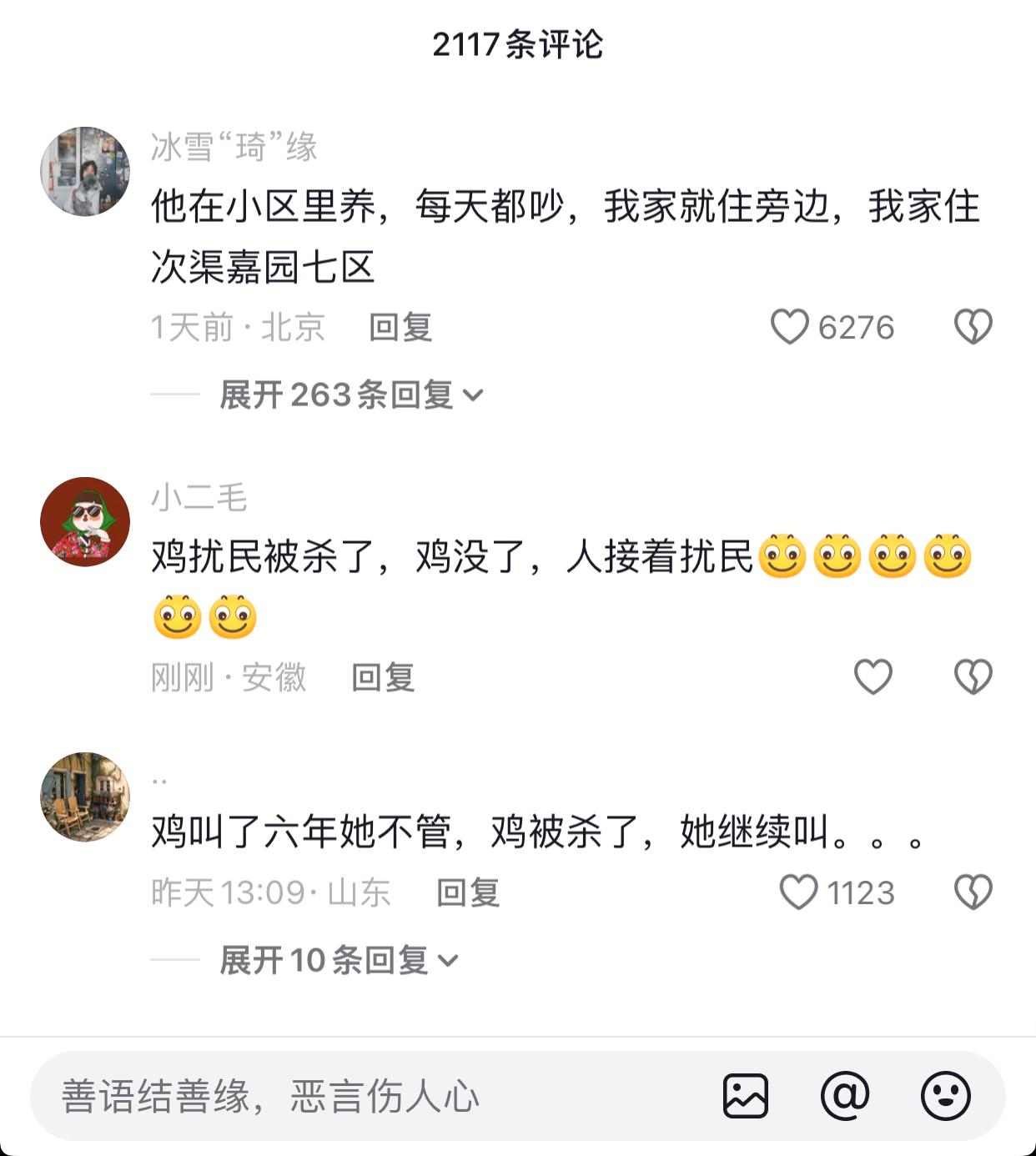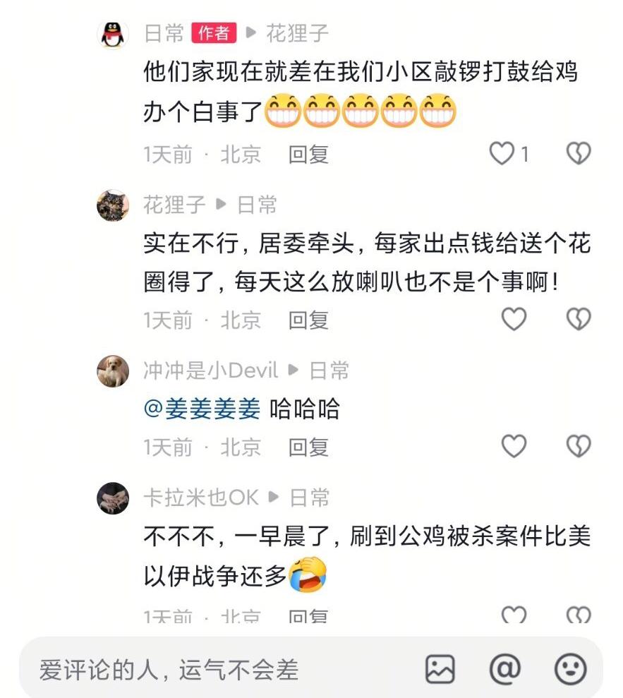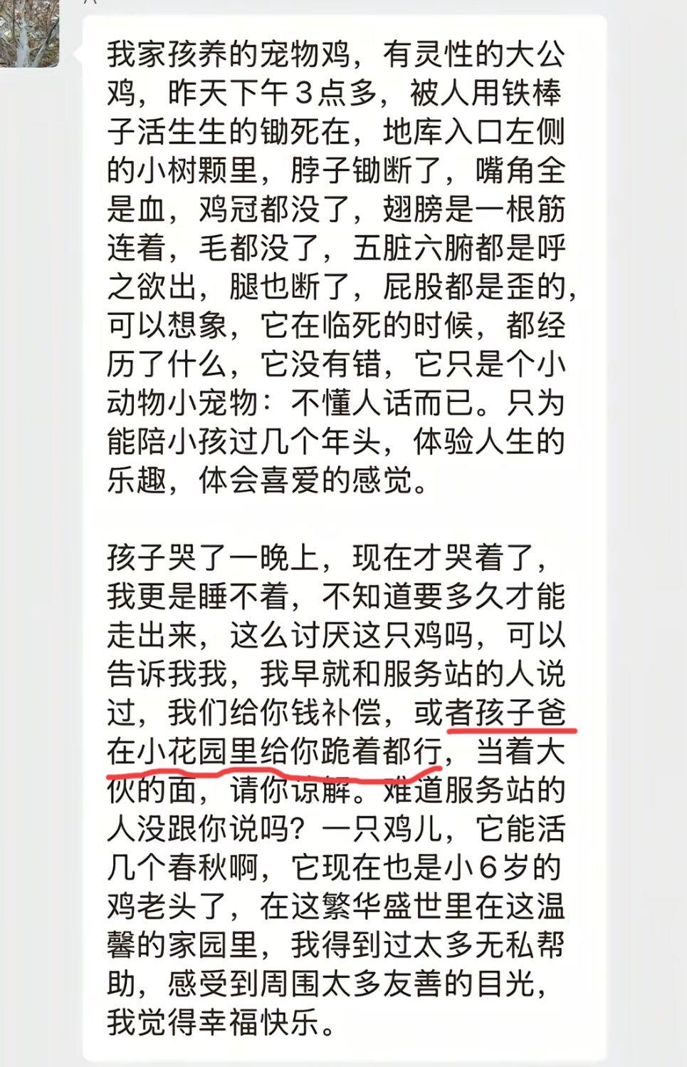 孩子他爸好惨的家庭地位… 近日,北京次渠嘉园杀鸡事件,在网络上广泛传播。起因是一大姐在小区里养了一只大公鸡,这鸡养了6年,平时是散养,鸡到处大小便,每天凌晨三四点就打鸣,在小区里遛人叼狗的,也算是小区里的一霸了! 如今鸡遭到了不幸,这位养鸡的大姐很是伤心,就每天用喇叭从早到晚的在小区里找杀鸡的人,当地网友说就算是凌晨了,这大姐都还在小区里用喇叭喊着… 现在鸡是不打鸣了,也不扰民了,换成这位大姐了… 其实大姐的心情也能理解,无论是什么小动物,毕竟养了6年,多多少少有些感情… 但面对鸡扰民时,你不管,甚至说让孩子爸去跪着,这属实是有点无赖了…