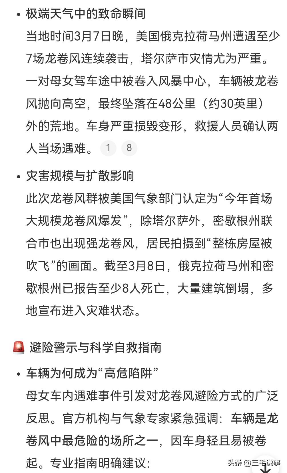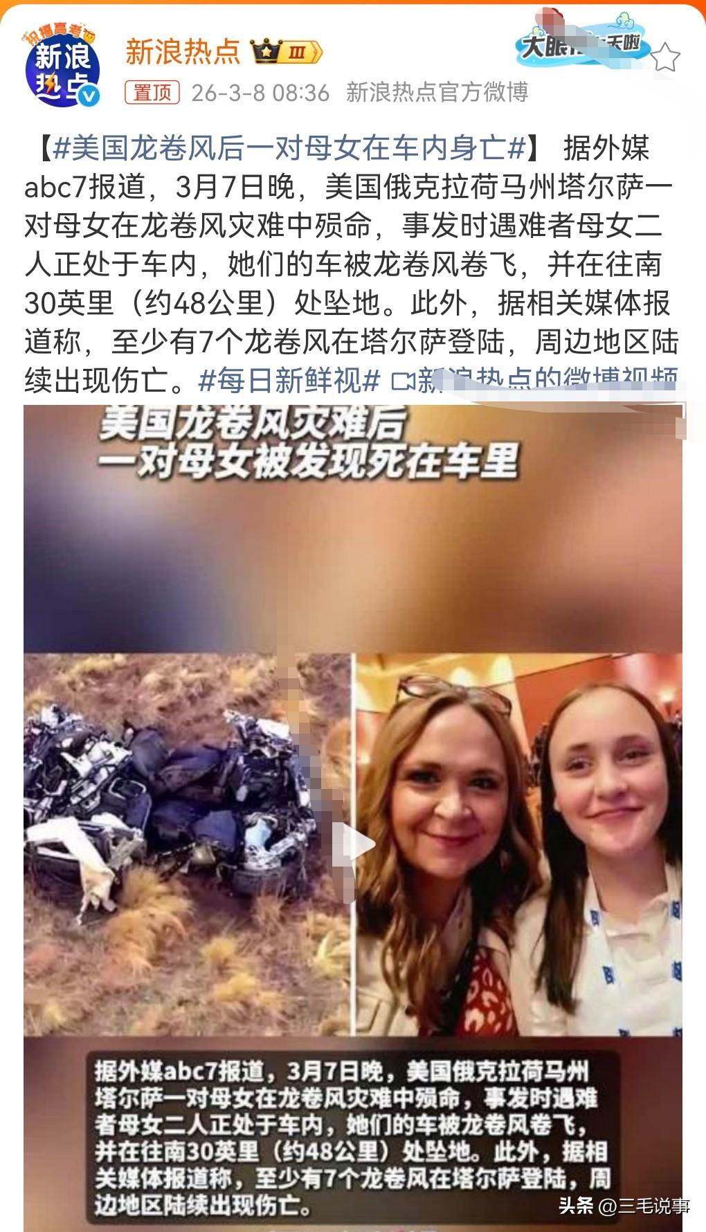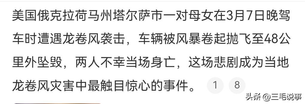 这真的是太悲剧了。 龙卷风的威力也太大了吧。 3月7日,美国龙卷风后一对母女在车内身亡。 车被龙卷风卷起,然后在48公里处的地方坠落。 威力真是惊人啊。 美国经常发生龙卷风,防不胜防。