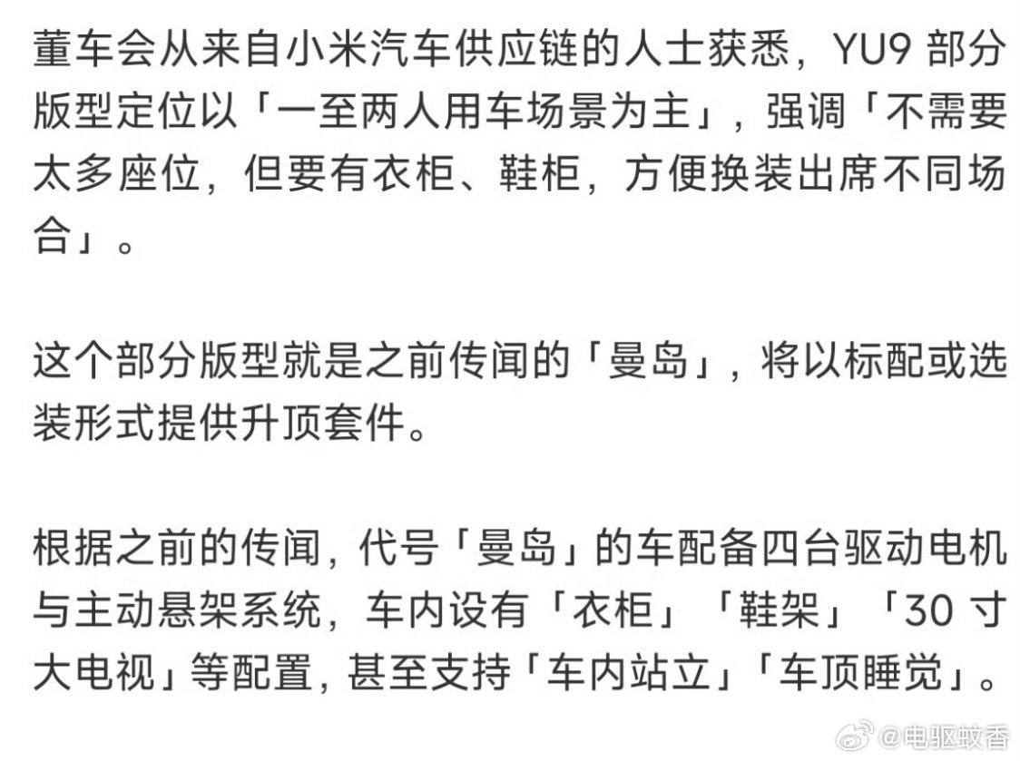 小米YU9,一个人或者小两口子是否也需要一个大车呢,大空间大功能全,却不需要那么多座位,顶升车顶拓展空间,期待看看市场啥反馈小米汽车