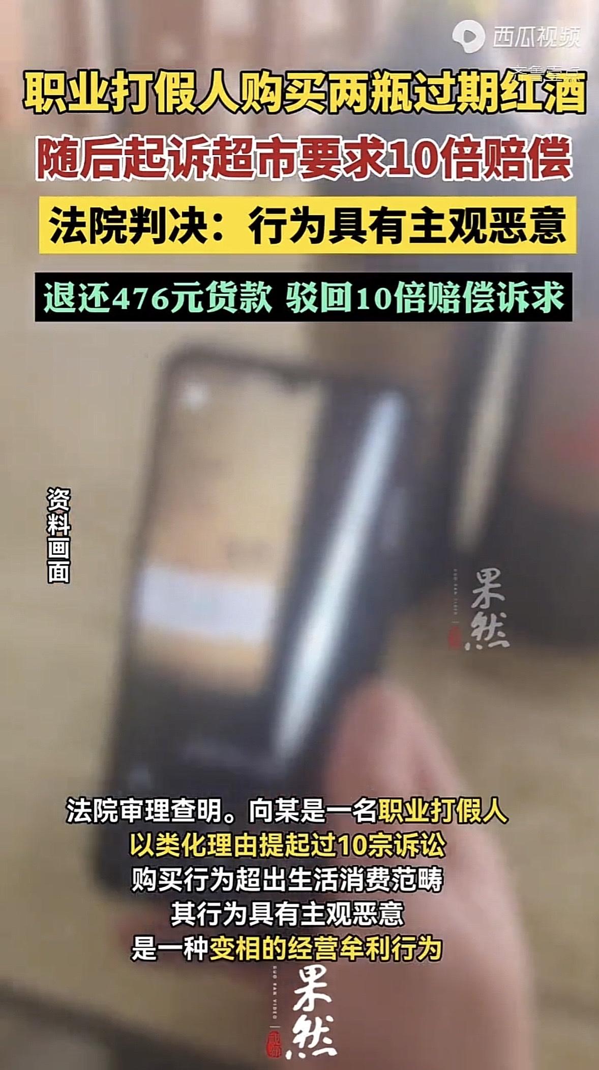 海南琼海,男子花476元在超市买了2瓶过期红酒,买完就以“购买过期食品”为由起诉超市,索赔5236元,然而,法院发现男子是职业打假人,经常知假买假,认为男子行为具有主观恶意,最终驳回了他的10倍罚款请求,男子最终只收到476的货款。 这天,向某溜达到一家超市,眼神在酒架子来回扫,最后定格在两瓶干红葡萄酒上。 不是因为酒好,是因为他眼睛毒,一眼瞅出瓶身上的日期不对劲。 按照标注,这酒已经过了8年保质期。 向某心里一乐,直接掏出476块钱,把这两瓶过期酒拿到收银台上结了账。 出了门,向某一纸诉状把超市告了,要求“退一赔十”,算下来5236块。 他觉得,这就是个无本万利的买卖,只要法院判了,这几千块就到手了。 可这回,向某的算盘没打响。 法官在庭上一查底,心里就有数了。向某哪是什么消费者?他是这一行里的老油条了,光是在法院系统里,以类似理由起诉的案子就有10起。 说白了,这就是职业打假人,靠这个吃饭、发财的。 他买这两瓶酒,根本不是为了喝,纯粹是为了搞钱。 再看那两瓶酒,法官也较了真。虽然标签上写着过期,但这酒精度数是12度。 懂行的都知道,国标规定10度以上的酒可以不标保质期。 超市标了个8年保质期,其实是多此一举,属于“标签瑕疵”,也就是写错了、写多了,但这酒本身大概率没坏,喝不坏人的。 法庭上,法官出问向某:这酒喝坏你了吗?你有证据证明酒不安全吗? 向某哪能拿出证据?他压根就喝过这酒,买来就是为了当证据的。 法官说了,如果这酒真有问题,那是超市的责任,该罚,但现在酒没事,只是标签有点小毛病,超市改过来就行。 可向某呢?明知酒没事,专门挑刺,还想靠这个发大财,这心思就不纯了。 法律保护消费者,但不保护这种以此牟利的职业打假。 《食品安全法》第148条第2款规定:生产不符合食品安全标准的食品或者经营明知是不符合食品安全标准的食品,消费者除要求赔偿损失外,还可以向生产者或者经营者要求支付价款十倍或者损失三倍的赔偿金…… 首先,向某是职业打假人,短期内提起10宗同类诉讼,其购买行为已超出生活消费所需,具有明显的营利目的,不属于法律倾斜保护的“消费者”范畴。 其次,案涉红酒酒精度为12%,根据国家标准(GB7718),酒精度≥10%的饮料酒可免除标注保质期。 超市标注“8年保质期”虽属标签瑕疵,但不影响食品本身的安全性。向某未能举证证明酒品存在有毒有害等实质安全隐患,也未造成人身损害。 最后,法院给了个折中的判决:超市把476块钱退给向某,毕竟东西还回去了。但向某想要的5000多块赔偿金,一分没有。 法律虽严厉打击食品安全违法行为,但不支持以牟利为目的的“知假买假”。 只有当食品存在实质安全风险且消费者因购买行为受损时,十倍赔偿才能成立,这也避免了赔偿制度被滥用为敛财工具。 判决下来后,向某脸拉得老长。他本以为是手拿把掐的生意,结果成了白忙活一场。 超市老板也是一肚子苦水,虽然没赔大钱,但惹了一身骚,还得搭上诉讼费。 现如今想靠买过期食品发财这条路,现在是越来越难走了。法律虽然给消费者撑腰,但也不是让人拿来当生意做的。 对此,你怎么看? 关注@运良说法 学法律知识不迷路