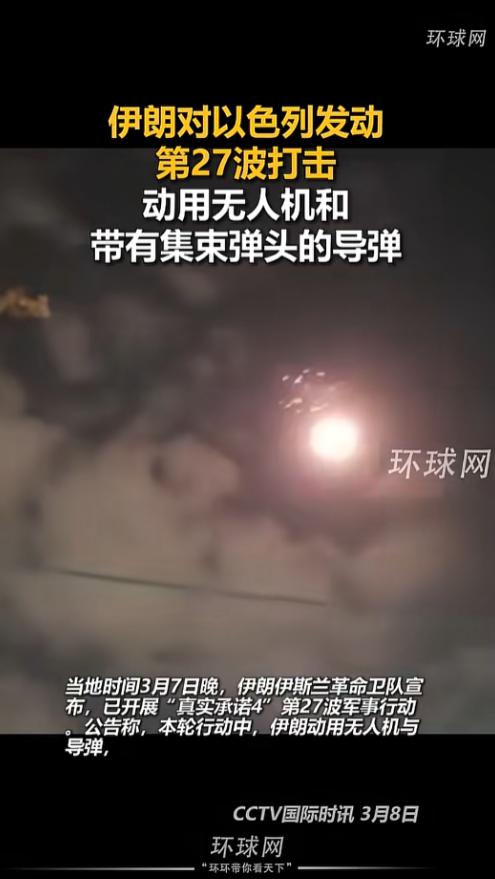 连轰27轮!伊朗火力全开,集束导弹直扑以色列本土,美军中东基地同步遭精准暴击,强硬反击彻底引爆地区局势,冲突全面升级。 这事的根儿还得往前倒,2月28日那天美以联手搞了场叫“史诗怒火”的空袭,把伊朗的核心军政大楼、导弹工厂甚至核相关目标都炸了个稀烂,连高层都有人伤亡。 因此从3月初开始,伊朗就没停过反击,短短8天时间,一轮接一轮干到第27次,节奏快得让人窒息。 这第27轮打击,伊朗明显是下了狠手,不光派出无人机,还掏出了带集束弹头的狠货。 这种导弹最绝的地方,就是飞到目标头顶会“爆开”,撒出一堆小炸弹,专门往大面积目标上糊,像军事基地、炼油厂这类目标,挨一下就得瘫痪大半。 连目标也分了两拨,一拨死磕以色列本土,北部海法的军事设施、炼油厂挨个被点名,以色列急眼了,直接把北部和中部的老百姓困在当地,明摆着是想拿平民当“人肉盾牌”挡导弹。 另一波直接冲美军去,阿联酋迪拜码头的美军驻地、巴林萨勒曼港里美军第五舰队的无人舰艇指挥部和后勤补给点全挨了揍,摆明了要断美军的“补给线”。 有人说这是“以牙还牙”,但这更像伊朗在用最粗暴的方式喊话“别把人逼到绝路”,你炸我的家园我就拆你的据点,你伤我的亲人我就让你疼到骨子里。 这27轮打击不是乱打,每一次都盯着要害,哪怕面对美以的先进防空网,也能硬生生撕开口子,把代价实实在在拍在对手脸上。 说到底,这场仗早就不是简单的报复了,伊朗用一轮又一轮的行动证明,就算家底不如人,也能靠“死磕到底”的韧劲,把美以拖进消耗战的泥潭。 而最让人心酸的,永远是夹在战火里的老百姓,他们成了博弈的棋子,一边要躲着飞来的导弹,一边还要被当成“人盾”,连活下去的安全感都成了奢望。 这第27轮轰炸,更像一个赤裸裸的警告,只要战火不熄伊朗的反击就不会停,中东的和平从来不是靠一方忍让换来的,真要想让老百姓过上安稳日子,总得有人先放下拳头把人命放在利益前面。 信息来源:环球网 2026年3月7日报道