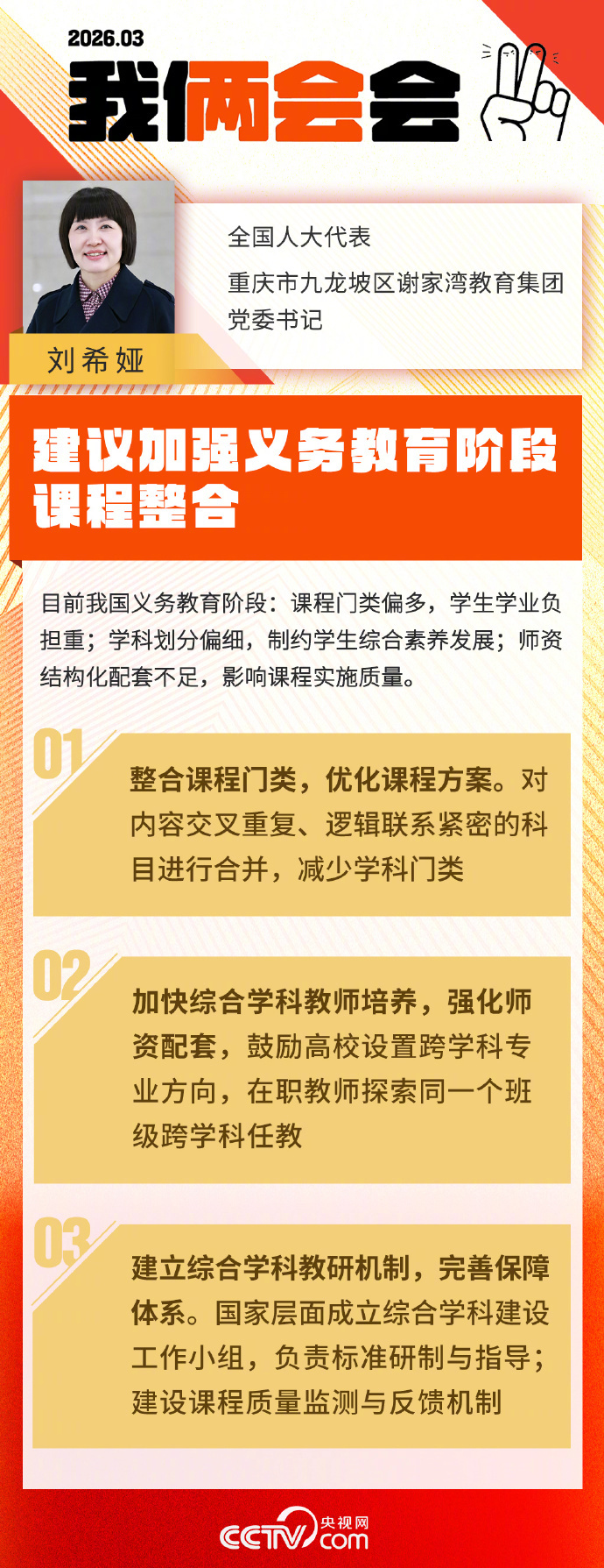 【全国人大代表刘希娅:#建议减少中小学学科数量#】#建议合并中小学部分学科# 全国人大代表、重庆市九龙坡区谢家湾教育集团党委书记刘希娅调研发现,义务教育阶段课程门类偏多,学科划分偏细,学生学业负担重。“部分地区小学阶段每周开设课程达11门以上,初中阶段更超过15门。”对此刘希娅建议:整合课程门类,优化课程方案;加快综合学科教师培养,强化师资配套;建立综合学科教研机制,完善保障体系。 (央视网)#建议给大龄农民工提供培训就业#