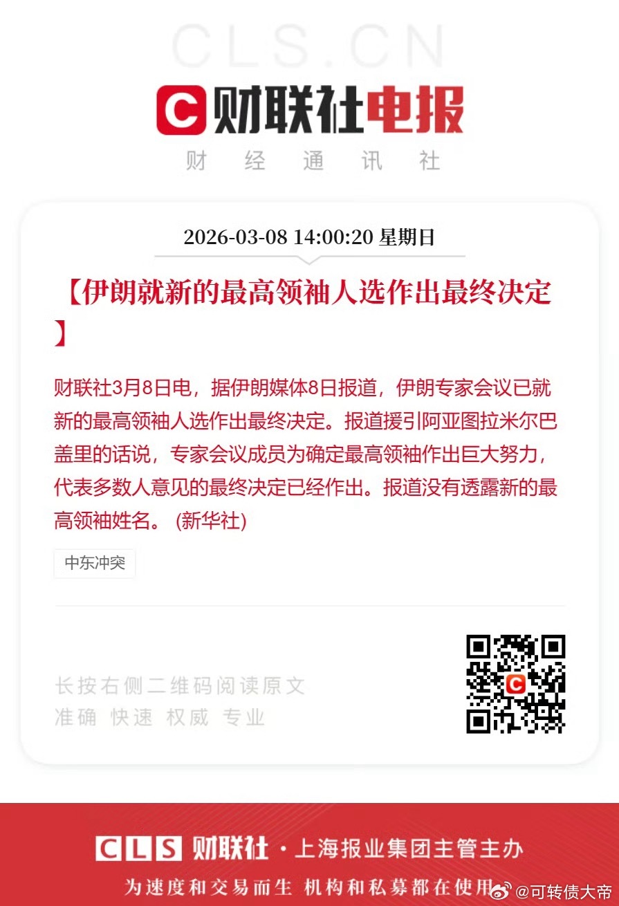 【伊朗就新的最高领袖人选作出最终决定】财联社3月8日电,据伊朗媒体8日报道,伊朗专家会议已就新的最高领袖人选作出最终决定。报道援引阿亚图拉米尔巴盖里的话说,专家会议成员为确定最高领袖作出巨大努力,代表多数人意见的最终决定已经作出。报道没有透露新的最高领袖姓名。 (新华社)