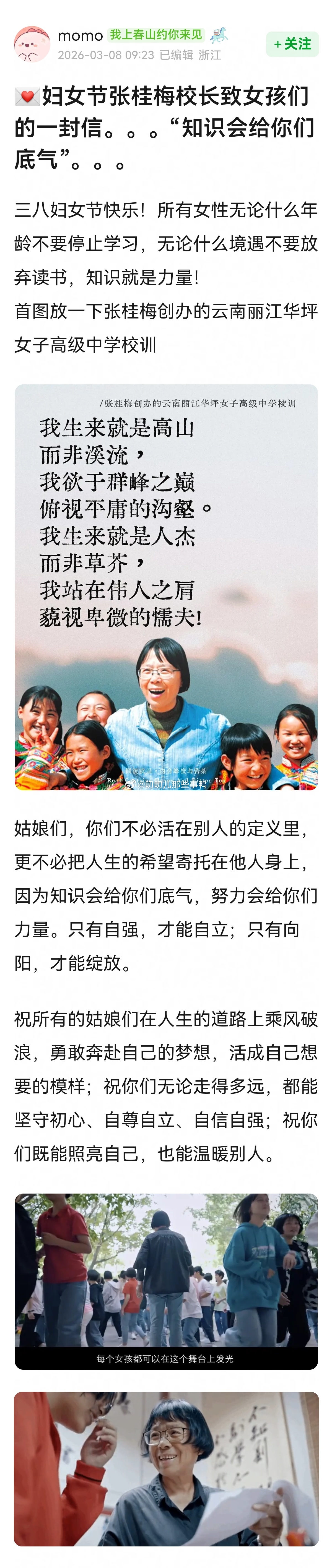 姑娘们,你们不必活在别人的定义里,更不必把人生的希望寄托在他人身上,因为知识会给你们底气,努力会给你们力量。只有自强,才能自立;只有向阳,才能绽放。