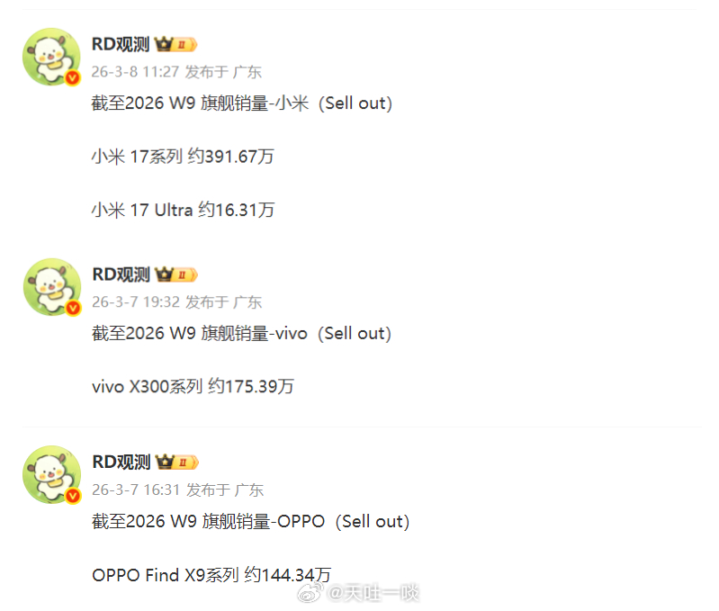 PS:在W9这一周小米17系列的销量为13.84万台;vivo X300系列的销量为10.34万台;OPPO Find X9系列的销量为9.33万台。据说这几个系列都要开始涨价了,有需要的朋友抓紧下手,一旦涨价就会后悔的。