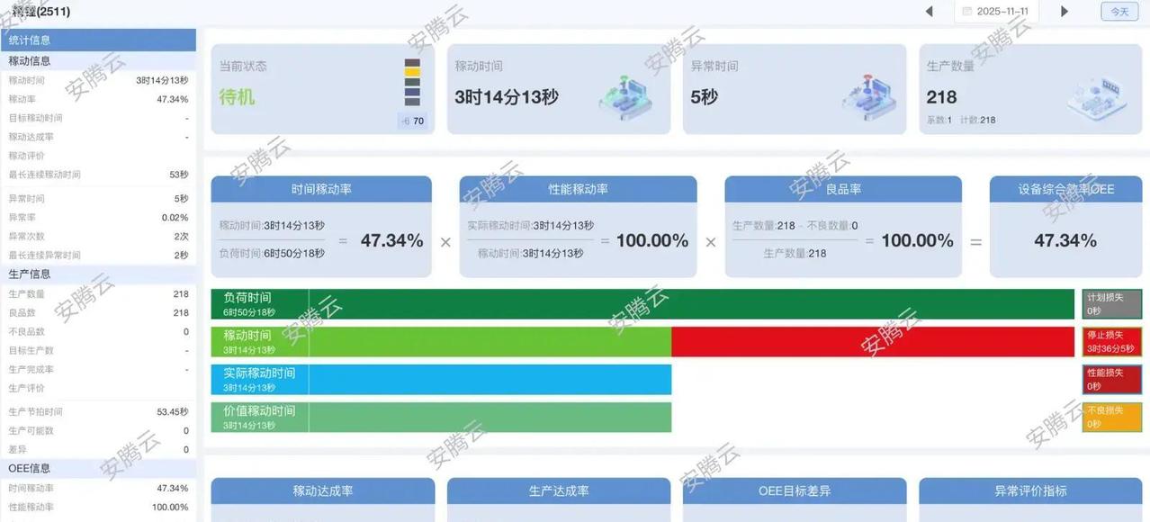 很多工厂机器天天转个不停,可月底一算产量却差一大截,OEE经常卡在60%出头,管理者拿着报表干瞪眼却找不到病根。 传统监控系统只甩个冷冰冰的总数字,停机为啥停、速度为啥慢、废品咋来的,全都糊里糊涂,优化等于空喊口号。 安腾云这套OEE稼动监视系统直接翻盘,它不光盯住设备每分钟状态,还把损失拆得清清楚楚:计划停、突发故障、跑得慢、做坏件,每条都对应具体机器和工序,一眼就能锁定罪魁祸首。 最狠的是系统不只报问题,还直接甩出干货方案:哪台老咳嗽就提醒换零件,哪步卡壳就调参数,哪个环节废品多就改操作规矩,管理者照着做就行,不用再靠拍脑袋猜。 不管厂里是老机床还是新产线,它用无线小灯塔一接就联网,零改动、通电就干活,手机电脑随时看数据,历史记录攒下来还能搞预防维护,从等坏了再修变成提前防住。 真实案例里,有家机械厂上了这系统,很快揪出3台主力设备老低速+常停机,维护加调参后,短短3个月OEE从62%直冲89%,每月多出5000多件货,收入直接多10多万。 全网数据现在中国很多工厂平均OEE还在55%-65%晃荡,智能系统一推能拉15-30个百分点,产能不用加设备就能爆,降本增效真不是吹的。 这套系统把数据从摆设变成真金白银的工具,工厂想真玩精益、挖设备潜力,它就是那把趁手的钥匙