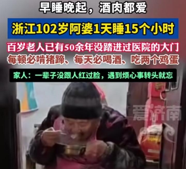 浙江台州,102岁阿婆每天睡15个小时,顿顿必须啃猪蹄,每天喝小酒,吃两个鸡蛋,堪称“最快乐的百岁老人”。 家人说,阿婆一辈子没和人红过脸,遇到烦心事转头就忘了,阿婆除了耳朵不太好、走路需要搀扶,精神头特别足,50多年几乎没进过医院,还能自己缝补穿针,手稳得很。 别人养生这也不敢吃那也不敢喝,阿婆主打一个随心所欲:爱吃肉、爱喝酒、爱睡觉,心态还特别好,一辈子不与人争执,啥事不往心里搁。 看完才明白,真正的长寿根本不是苛刻忌口,而是吃得香、睡得沉、心放宽。阿婆这又香又自在的百岁生活,太让人羡慕了!必须沾沾福气,祝阿婆平安健康、福寿绵长!