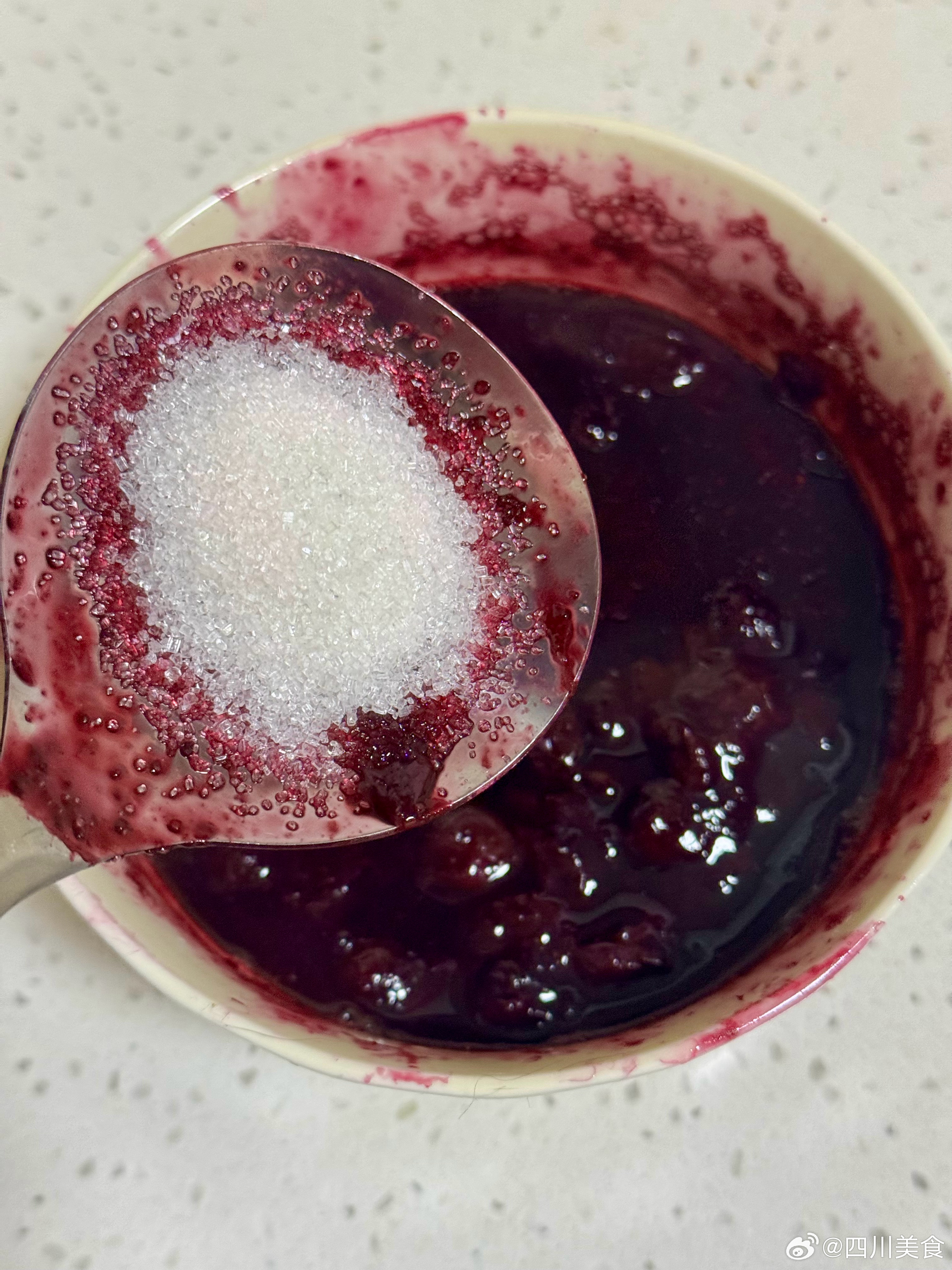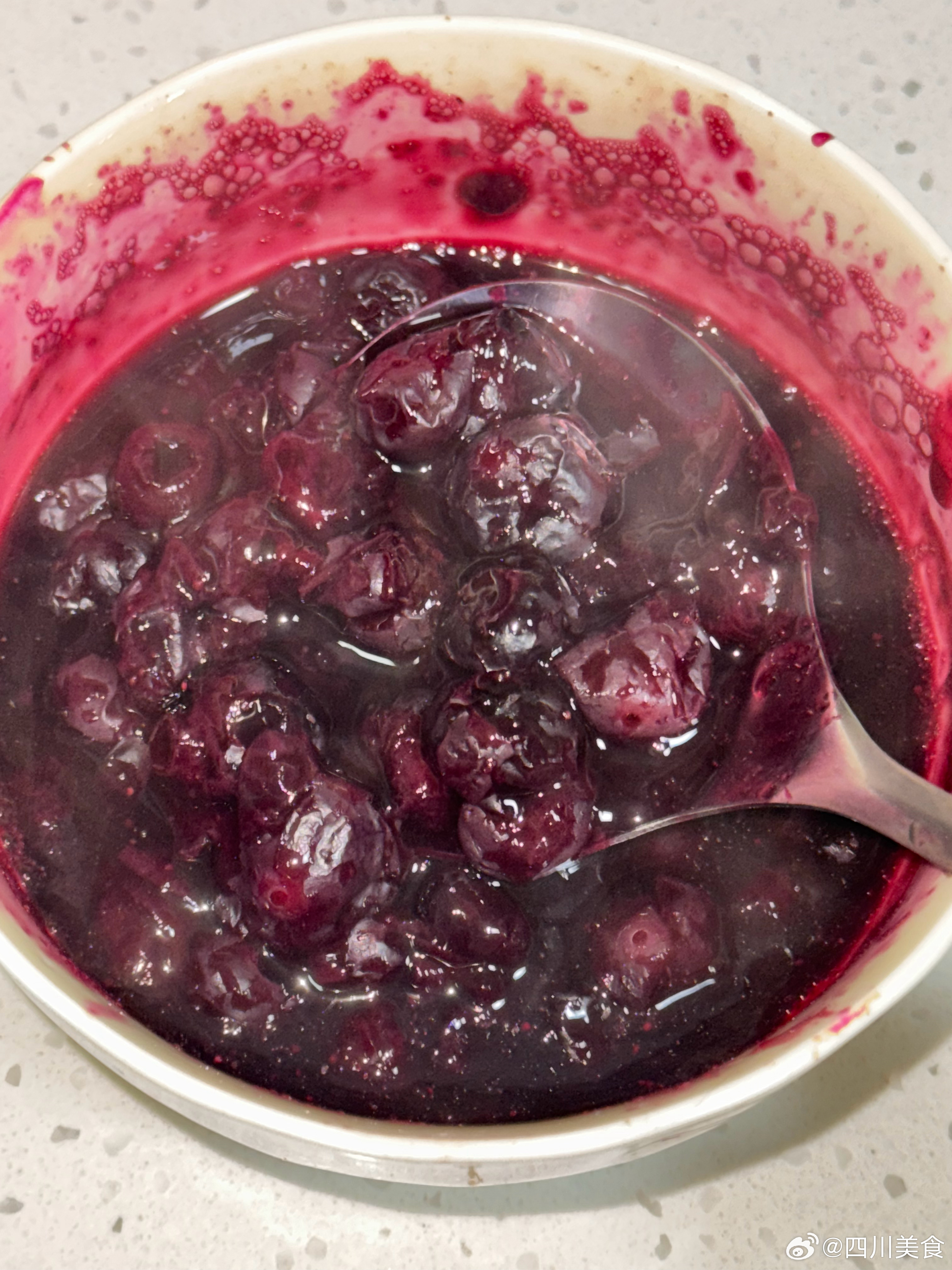 微波炉五分钟速成蓝莓酱,之前买的一大袋冻蓝莓还剩很多,试着做点蓝莓酱;