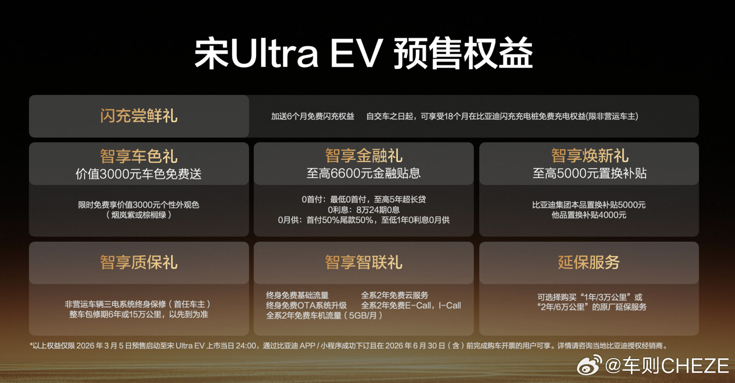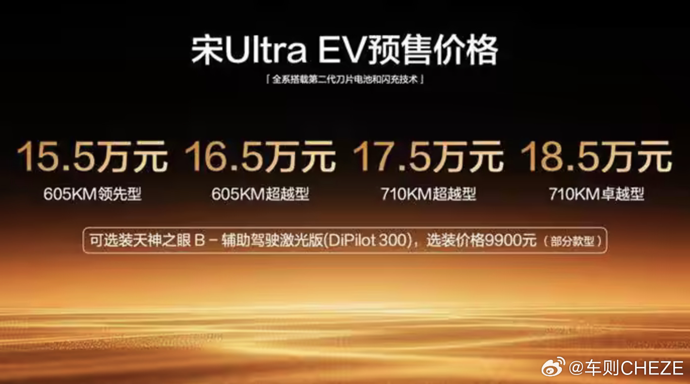 15万价位的车配激光雷达+城区智驾,宋Ultra EV开启预售。近期,宋Ultra EV开启预售:710km长续航,上车闪充技术,5分钟充到70%,18个月免费闪充,支持选装激光雷达(9900元),搭载了天神之眼B辅助驾驶系统(DiPilot 300),支持城区领航、高速领航、窄路自动通行。动力部分,新车电机最大功率270kW,最高时速210km/h。全系标配云辇-C智能阻尼车身控制系统,搭配前麦弗逊+后五连杆独立悬架。同时,进一步上车TBC高速爆胎稳行系统。即使再140km/h的速度下爆胎,系统也能毫秒级响应稳住车身。这套系统很熟悉了,在比亚迪体系高端车型中(30万级)很常见。尺寸上新车轴距达2840mm,定位大五座B级SUV。内饰具备女王副驾、前排座椅通风加热按摩、四音区语音交互、手机无线充电等等。!B级闪充SUV宋Ultra预售15.5万起