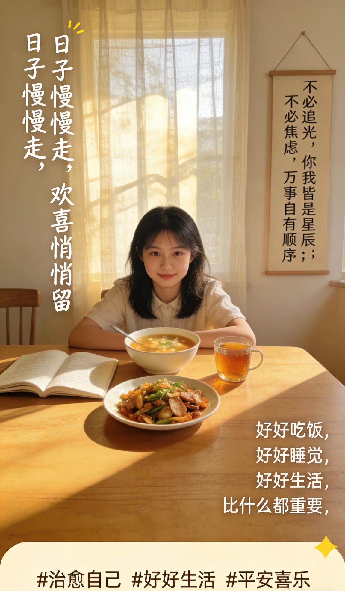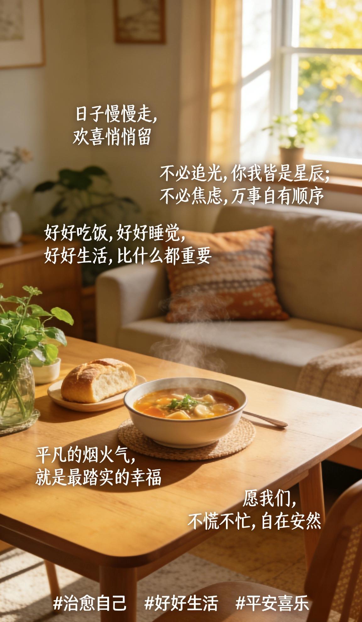 日子慢慢走,欢喜悄悄留。 不必追光,你我皆是星辰;不必焦虑,万事自有顺序。 好好吃饭,好好睡觉,好好生活,比什么都重要。 平凡的烟火气,就是最踏实的幸福。 愿我们,不慌不忙,自在安然。 治愈自己 好好生活