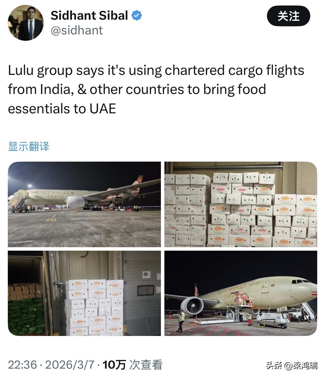 根据 2026 年 3 月 7 日 的最新报道,由于区域冲突(如伊朗与以色列之间的紧张局势)导致常规货运能力受限,Lulu 集团通过包机方式从印度等国大量运送生鲜物资,以确保阿联酋境内超市的货架供应充足。 以下是该行动的关键细节: 1. 物流规模与运送内容 运载量:最近一次由 阿提哈德货运(Etihad Cargo) 执飞的航班一次性向阿布扎比运送了约 80,000 公斤(80 吨) 的生鲜食品。 货物品类:主要包括约 12,000 箱新鲜水果和蔬菜、肉类以及家禽等易腐必需品。 来源地:主要货源来自印度的 科契(Kochi) 和 新德里(New Delhi)。集团还计划从孟买、班加罗尔以及澳大利亚的墨尔本等全球其他采购市场调拨更多物资。 2. 成本与价格影响 运费差异:空运包机的成本通常是普通海运的 3 倍 左右。从印度运送货物的标准海运成本约为每公斤 1-1.5 美元,而包机空运则需 3-3.5 美元。 价格承诺:尽管运输成本大幅增加,Lulu 集团表示在阿联酋政府的支持下,不会将增加的成本转嫁给消费者。政府正与零售商密切合作,确保市场价格保持稳定和低廉。 Lulu 集团(LuLu Group International)是一家总部位于阿联酋阿布扎比的跨国多元化企业,也是中东地区最具影响力的零售巨头之一。 该集团的创始人:由来自印度喀拉拉邦的亿万富翁 M.A. Yusuff Ali 于 1995 年创立。 企业地位:被德勤评为全球最具实力的零售商之一,年营业额约 84 亿美元。 资本市场:其零售业务子公司 Lulu Retail 已于 2024 年底在阿布扎比证券交易所(ADX)上市。