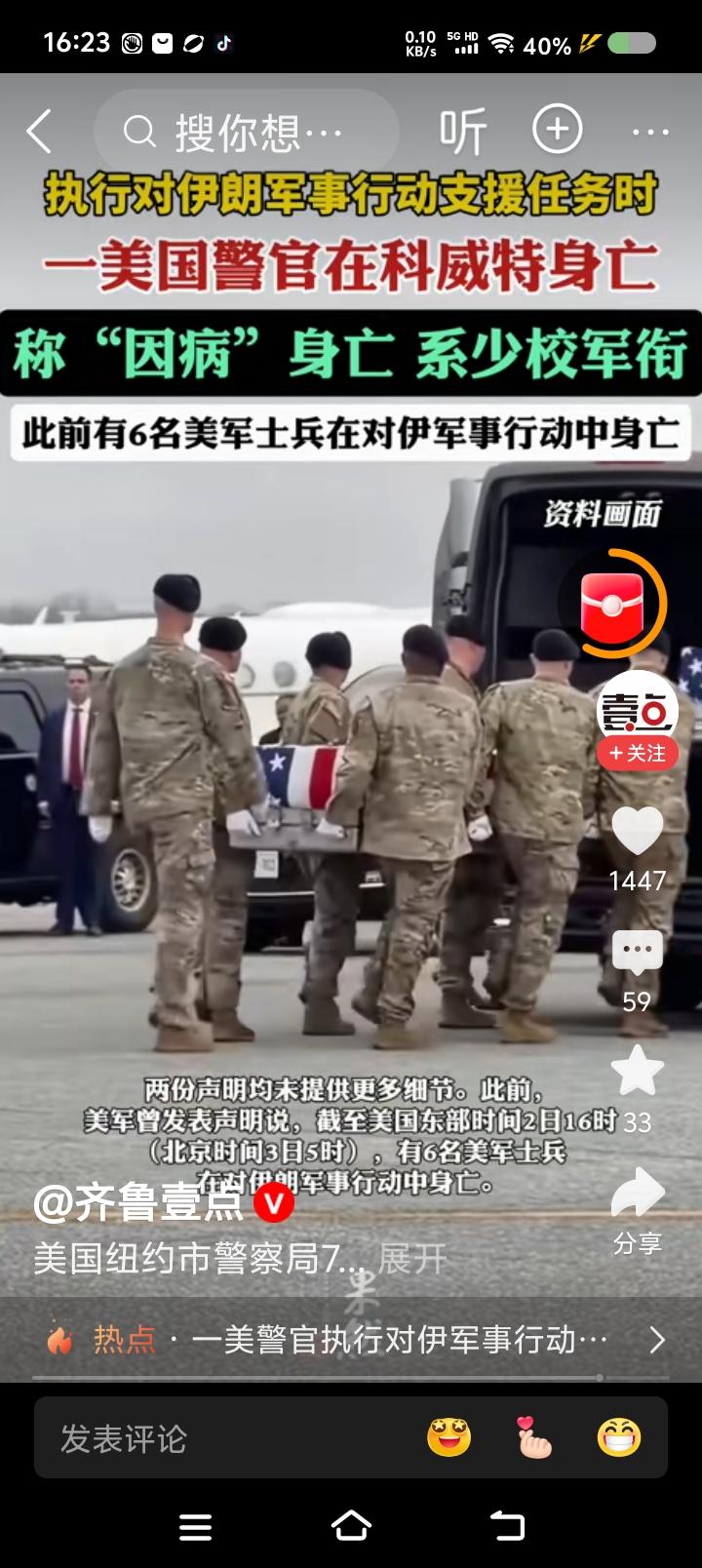 美国一名警官在科威特身亡—— 据报道,美国一名警官在科威特执行对伊朗的军事任务,“因病”身亡。纽约州州长、市警察局均发表声明,未透露更多细节。 点评: 有网友评论:“特朗普付不起抚恤金了?” 中国有句俗话,“泥巴掉进裤裆……” 更悲哀的是,这是重于泰山,还是轻于鸿毛? 美国人表面上可值钱了,死一个兵死一个警察,都会把仪式感拉满。问题是,什么是国家利益?美国是谁的美国?这些牺牲值得么? 美国人从来不想这些问题么?