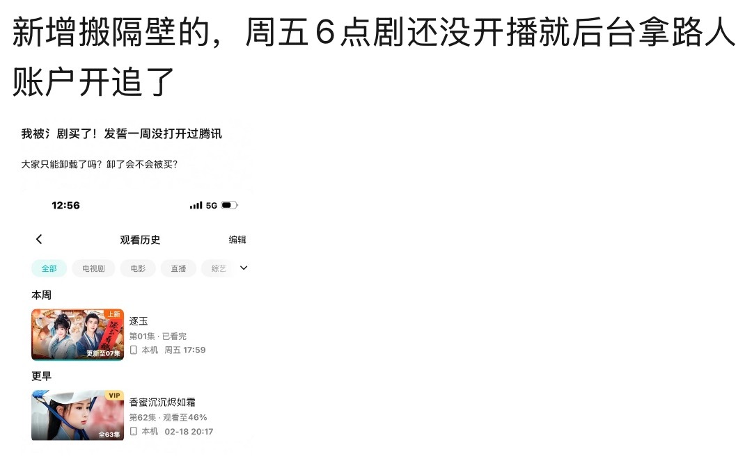 豆瓣有网友说腾讯视频为了逐玉预制爆款让没打开app的人自动观看了,周五剧还没开播就拿路人账户开追了,这都是什么啊,算不算侵犯用户隐私呢?腾讯视频你出来解释一下吧,以后谁还敢用你的app啊,太可怕了,是不是用户不需要主观能动性了,程序员内部操作一下就好……逐玉云合翻倍逐玉逐玉战报