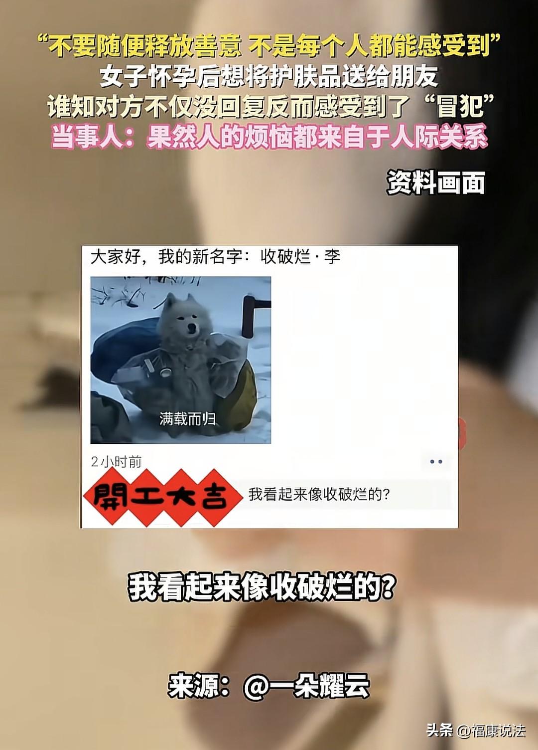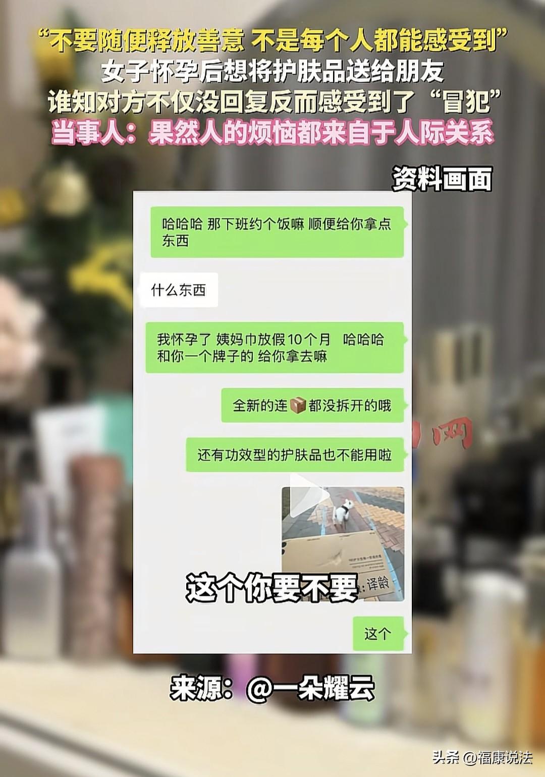 “敏感还是玻璃心?”辽宁,女子怀孕了,给朋友发信息,要把未使用的护肤品、卫生巾送给她,可朋友一直不回消息,女子却在15分钟后,看到朋友发了一条朋友圈配文:我看起来像收破烂的?女子瞬间憋闷:唉!果然人的烦恼都来自于人际关系! 女子偶然间发现自己怀孕了,满心都是即将成为妈妈的欢喜与期待。 她深知孕期诸多注意事项,有些护肤品已不再适宜使用,便想着将这些未开封的护肤品送给朋友,以为朋友会开心的收下,可是,她没想到真是拿自己的热脸贴人家冷 屁 股。 女子精心挑选出那些尚未开封的护肤品,拍了照片,满心欢喜地发给一位平日里关系不错的好友,问她要不要? 朋友很快回了消息,问是什么东西? 女子便热情地提议:“下班咱们约个饭吧,我顺便给你带点东西。我怀孕了,这些护肤品和卫生巾都用不上了,而且和你平时用的牌子一样,给你拿去用怎么样?” 然而,消息发出去后,女子却迟迟没有等到朋友的回应。 她沉浸在分享的喜悦中,并未多想,又继续发了好几条消息,强调这些护肤品都是全新的,还没拆封。 可这些消息就像投入了无底深渊,朋友那边依旧毫无动静。 女子以为朋友可能没理解自己的意思,便又耐心地解释:“护肤品里的精华产品放久了效果会打折扣,所以我想着给你用,都是崭新的,而且是我之前一直在用的。” 但即便如此,朋友依旧没有回复。 女子开始有些焦急了,她详细地介绍起护肤品的功效,试图说服朋友接受这份心意。 可对方依旧没有回应,仿佛消失了一般。 女子有些灰心丧气,她猜测朋友可能不喜欢这些护肤品,或者有其他原因。 为了打消朋友的顾虑,她又发了一条信息:“你要是用着不喜欢,丢掉也没关系的。” 她以为这样朋友就会接受,可即便话已至此,朋友那边依旧毫无消息。 女子终于放弃了,但心里却充满了困惑和不解。她不明白,自己一片好心送朋友东西,为何却得不到预期的回应呢? 更让女子心寒的是,在她给朋友发完消息的15分钟后,她无意间看到朋友发了一条朋友圈,配文是:“我看起来像收破烂的?” 这句话像一根刺,深深刺痛了女子的心。她开始怀疑,是不是自己的做法让朋友感到不适了? 但女子又觉得自己很无辜,那些东西都是全新的,而且是自己花钱买的,她只是想表达一份善意而已。 然而,朋友却再也没有回复她的信息,这段友谊似乎也因此出现了裂痕。 女子不禁感叹:“唉!果然,人的烦恼大多都来自于人际关系。” 事后,她对这件事有了新的感悟,她说以后不要随便释放善意了,因为不是每个人都能感受到并珍惜你的善意。 女子把这段经历发到了网上,询问大家:“是我太敏感了吗?还是我真的被朋友内涵了?” 有人说,真正的好朋友是听到你怀孕了,像“土匪”一样提着麻袋就来了,搜刮你的“一切”。 如果我朋友她说她怀孕,她的护肤品还有卫生巾什么之类的给我,我会觉得他对我好好啊,第一时间想到的是我。 有网友分享:主要是关系没到位!可能是你把她当成很好的朋友,可是她没有!我怀孕,我问我闺蜜要不要卫生巾,这丫头的一下班,直接提起口袋就来了,把我卫生巾、护肤品、化妆品、香水全部打包走了,走的时候说洗脸巾没得了,还顺了一盒洗脸巾走。 也有人说,站在你朋友角度,你说全新的,我可能以为是要给钱的。除非你明着说送给我,如果只说给我拿点东西,我真的以为是不是多多少少要给回钱你,但是我不会不开心,更不会发朋友圈蛐蛐对方。 还有人说,人在极度自卑的时候,会显得非常无理。这句话的含金量还在持续上升…… 其实,女子的做法没毛病。她怀着分享的心情,把未开封且的护肤品送给朋友,是一片赤诚。 朋友不领情可以理解,毕竟每个人想法不同,但发朋友圈内涵就过分了。 这不仅伤害了女子感情,也破坏了彼此情谊。 人际交往中,善意应被珍惜,即便不接受,也该好好沟通。 朋友这种做法,会让愿意释放善意的人寒心,以后可能就不敢再轻易对她好了。 《民法典》第7条规定:民事主体从事民事活动,应当遵循诚信原则,秉持诚实,恪守承诺。 此事中,女子本是好心,因怀孕用不上护肤品,想着送给朋友,这是出于善意和分享。 可朋友却未回应,甚至发朋友圈暗讽,这显然违背了人际交往中应有的尊重与善意回应原则。 朋友若不想要,本可以礼貌拒绝,而不是用背后发朋友圈这种伤人的方式,这种行为不符合基本的社交礼仪和道德规范。