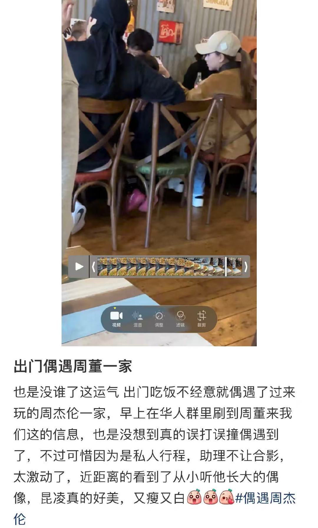 澳大利亚偶遇周杰伦昆凌一家 偶遇周杰伦昆凌一家吃饭 3月8日,有网友在澳大利亚偶遇周杰伦、昆凌一家吃饭。