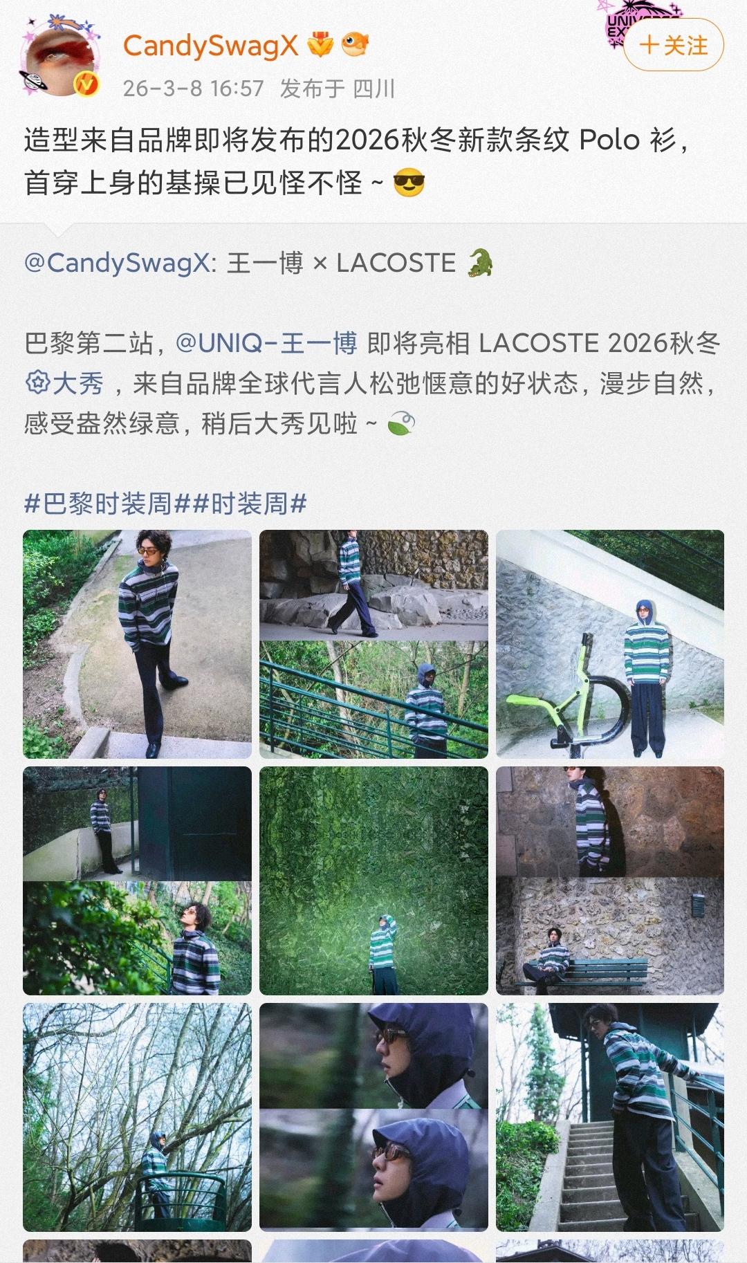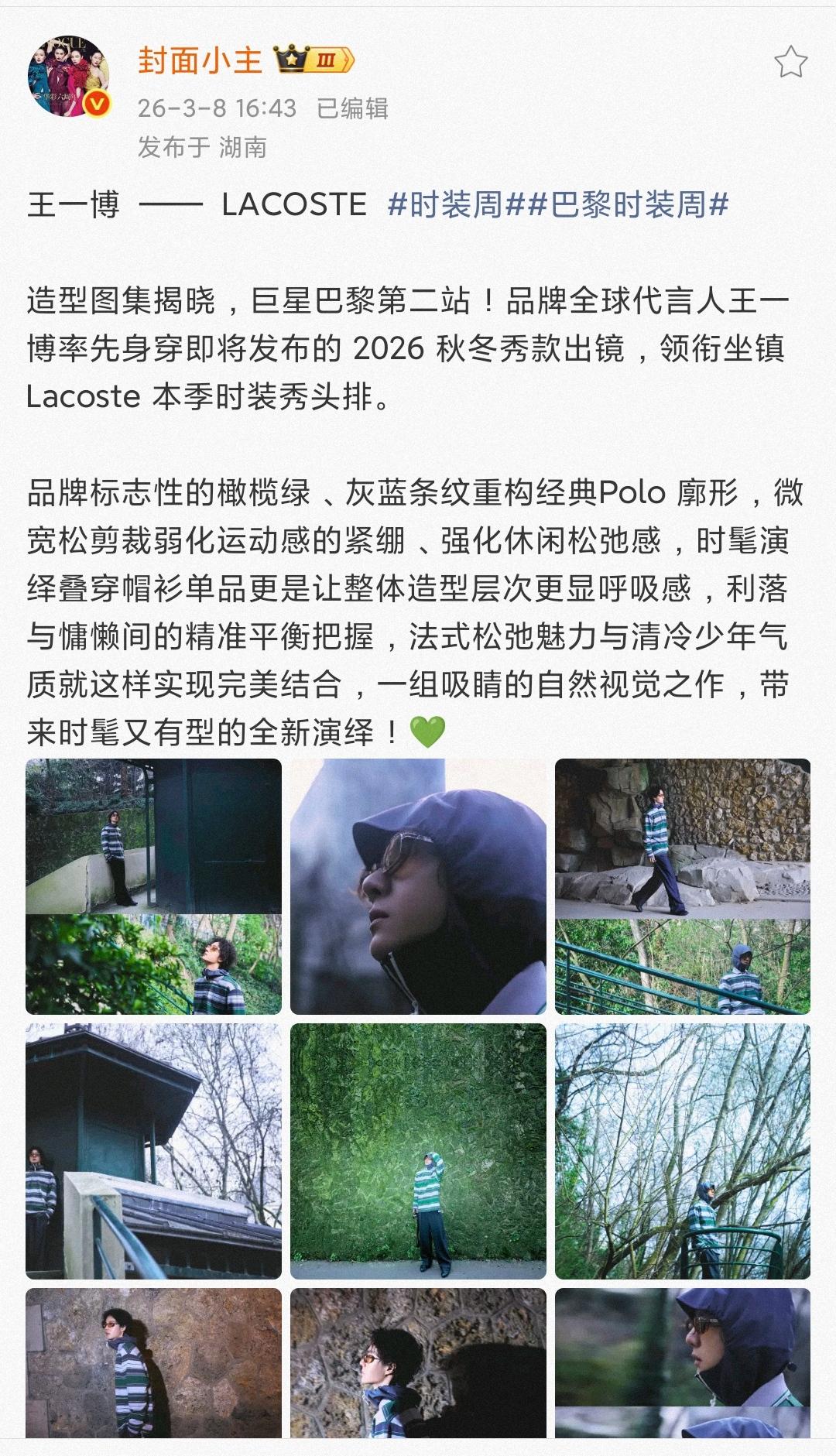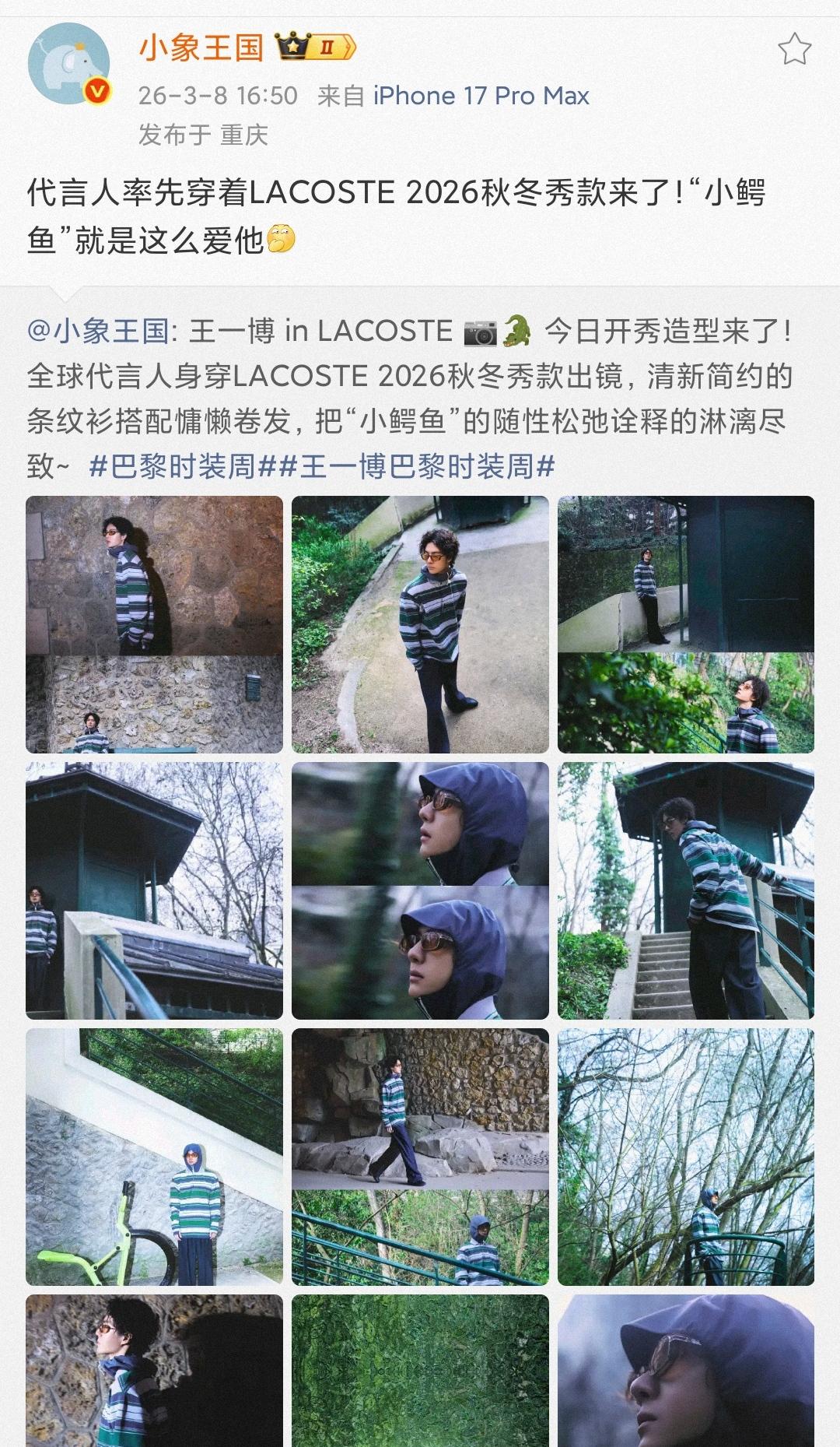 王一博巴黎时装周第二站Lacoste大秀新物料一出,时尚博主又又又沸腾了! 已经夸出花!没有生搬硬套,没有干瘪无趣,没有词穷硬抠,只有激动、兴奋和发自肺腑的夸夸夸!!! “即将发布的2026秋冬新款已经提前上身” “巨星的next level从来不是先走一步,而是真真正正站到了更高层面” “小鳄鱼就是这么爱他!” “首穿上身的基操已见怪不怪” 期待马上开始的Lacoste巴黎时装周大秀! 王一博 王一博巴黎时装周