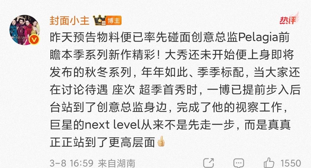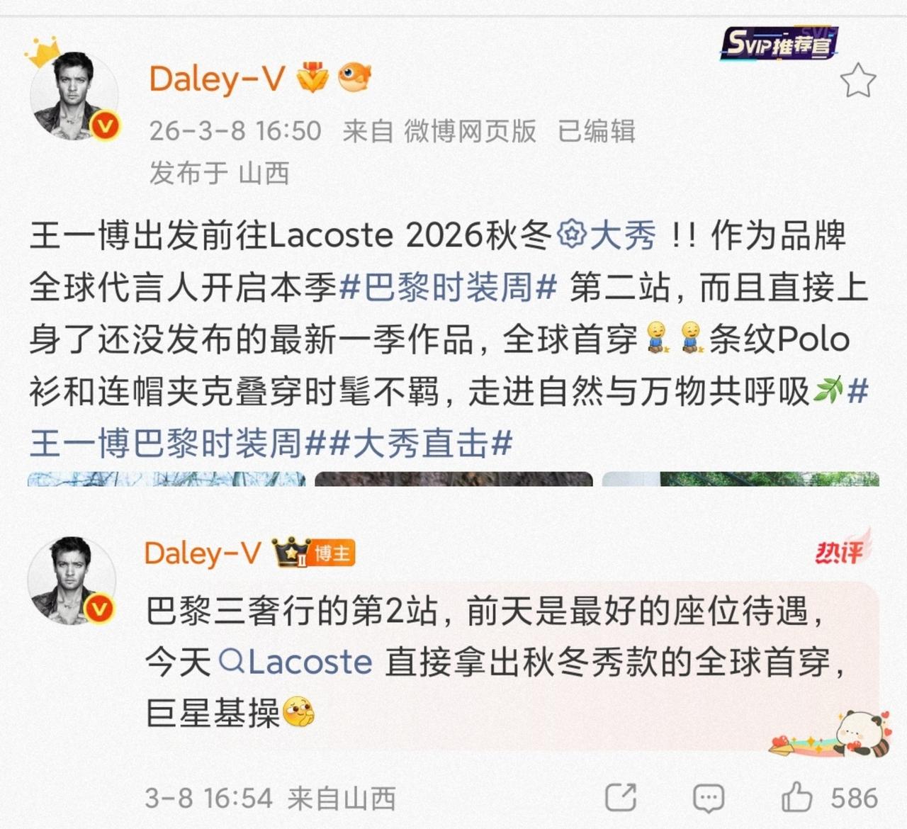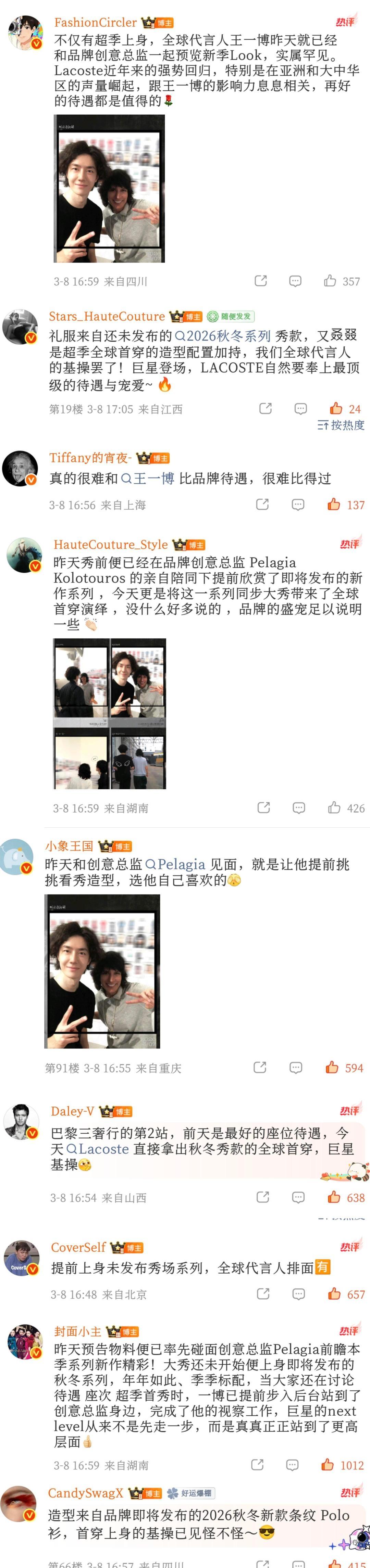 王一博巴黎时装周第二站Lacoste大秀新物料一出,时尚博主又又又沸腾了! 已经夸出花!没有生搬硬套,没有干瘪无趣,没有词穷硬抠,只有激动、兴奋和发自肺腑的夸夸夸!!! “即将发布的2026秋冬新款已经提前上身” “巨星的next level从来不是先走一步,而是真真正正站到了更高层面” “小鳄鱼就是这么爱他!” “首穿上身的基操已见怪不怪” 期待马上开始的Lacoste巴黎时装周大秀! 王一博 王一博巴黎时装周