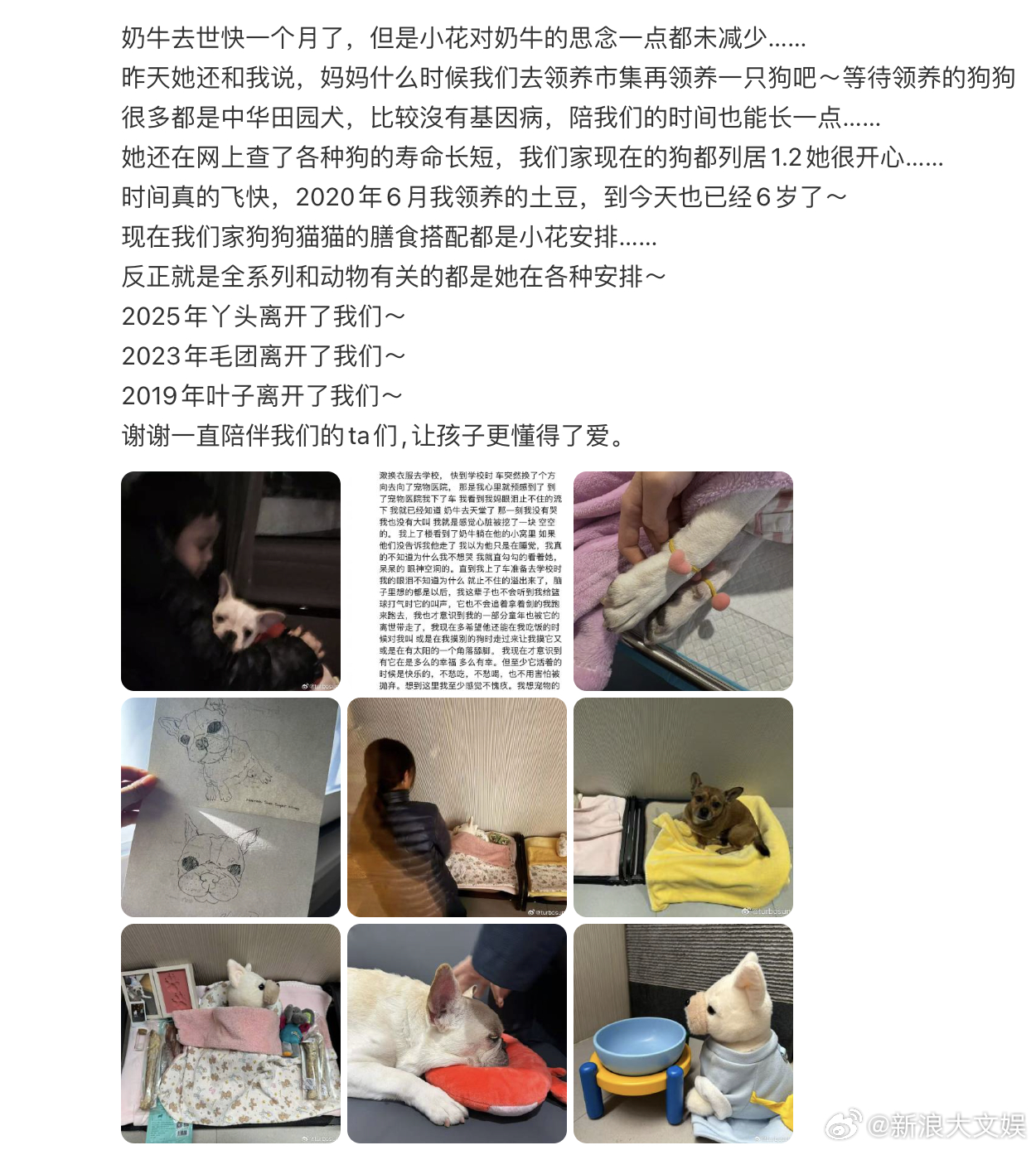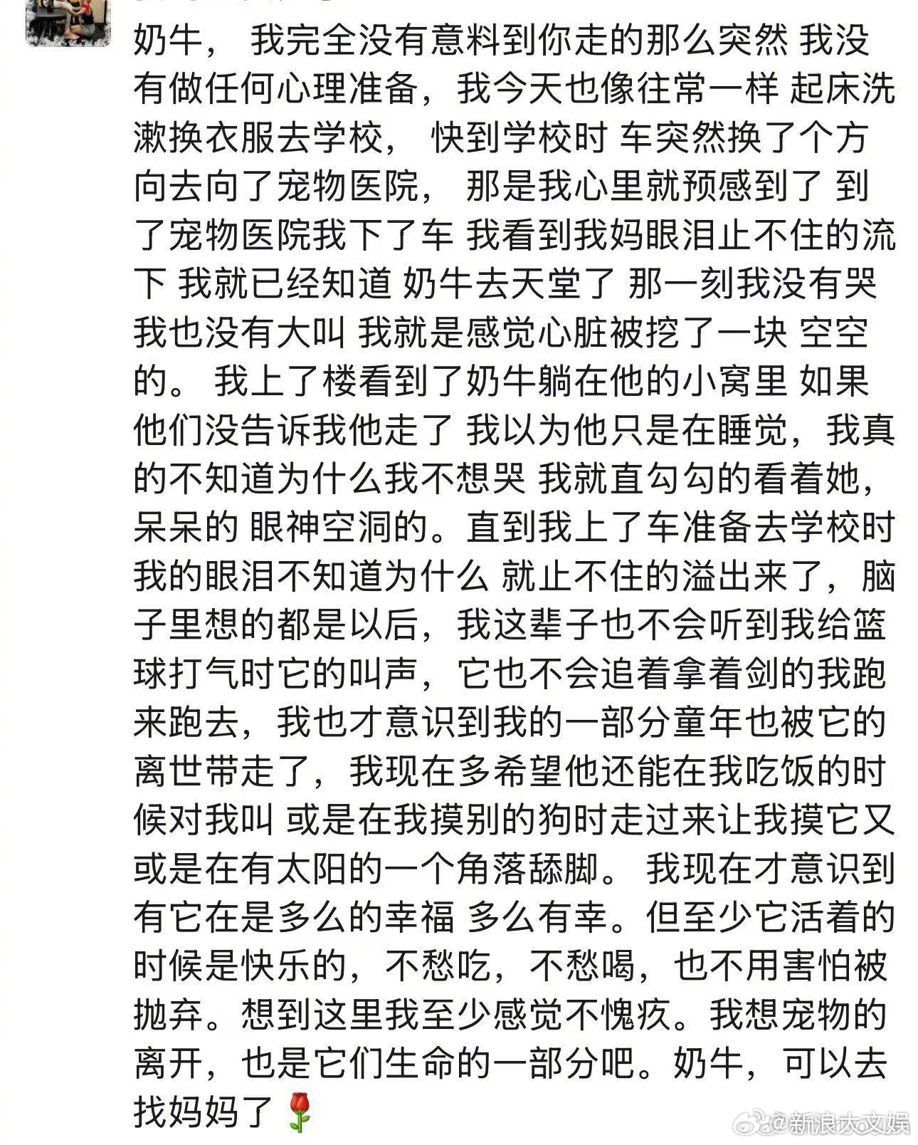 孙俪家的小狗奶牛去世了 孙俪家的小狗奶牛去世了,等等写了篇日记,小花选了两个爱心皮筋戴在了奶牛的手上,“希望她能带着我们的爱早日再次来到我们身边”,好有爱啊!